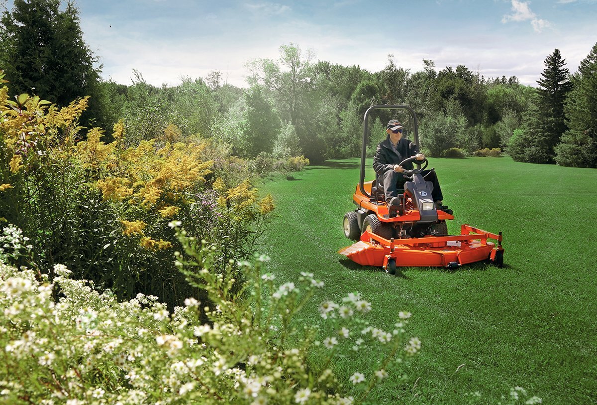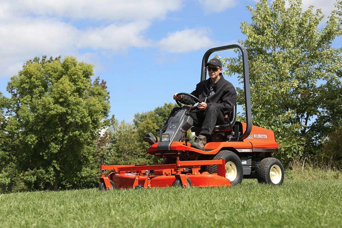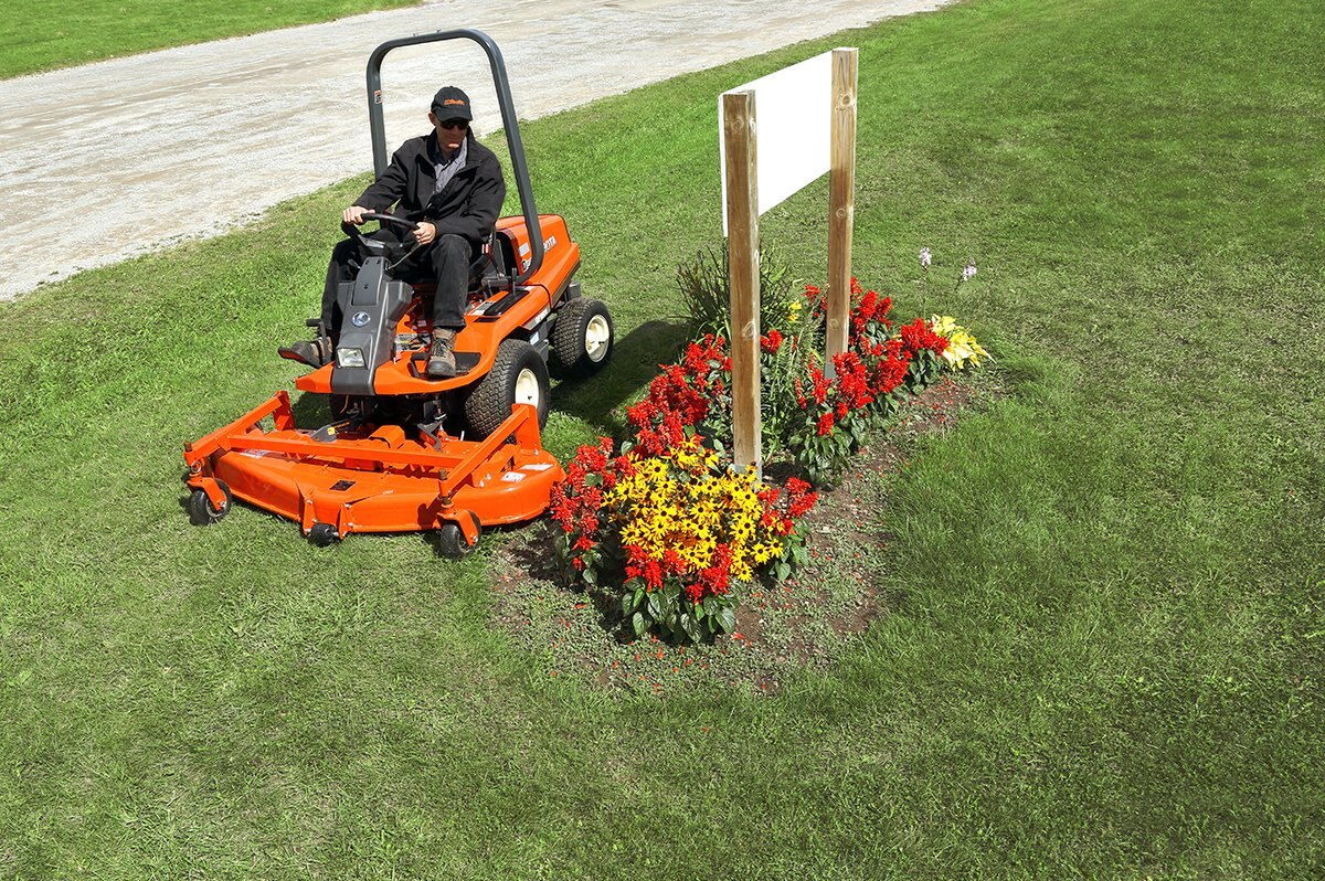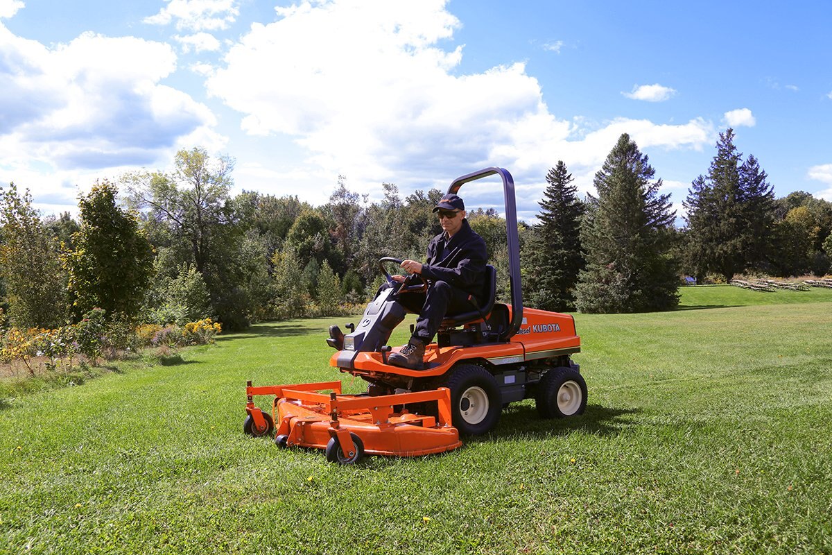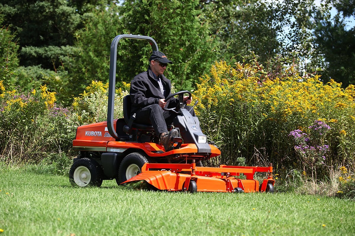 | Kubota offers two highly compact, agile and economical front-mount tractors: the GF1800 (4WD) and the GF1800E (2WD). The compact, lightweight design of these 18-horsepower diesels offers superb handling for tight turns around trees, hedges and flower beds in 2 or 4 wheel drive. They give you fuel saving operation while providing plenty of power for tough jobs. Best of all, these versatile performers are easy and comfortable to operate. They offer a variety of safety features and require only minimum maintenance. With either model you have a wide choice of mower decks to trim your work down to size. |
