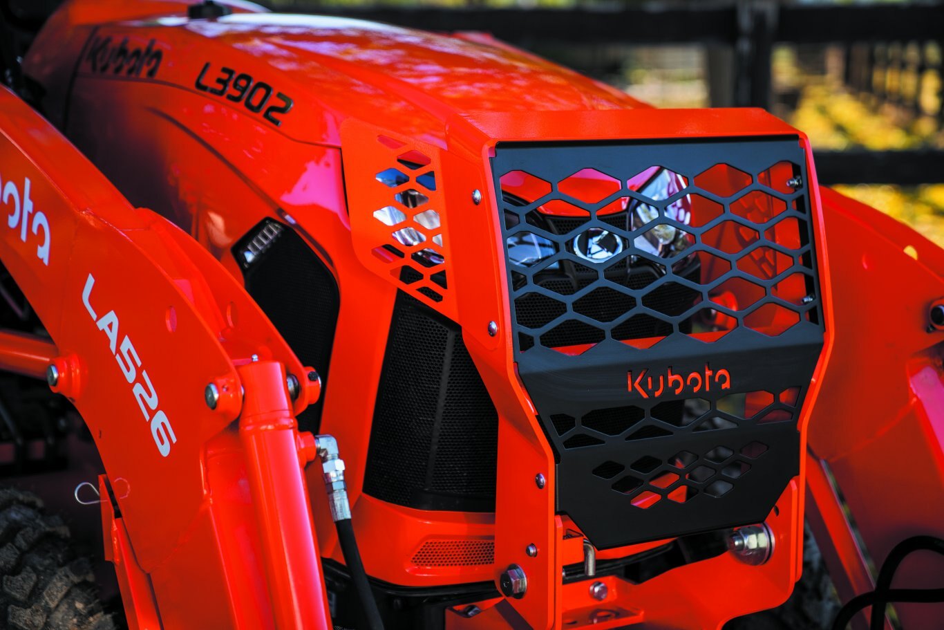 Updated bonnet and grille keep engine and tractor protected from the elements. Ergonomically designed lever grips and steering wheel provide easier access and smooth operation. The new LED work lights deliver great visibility in tough conditions.