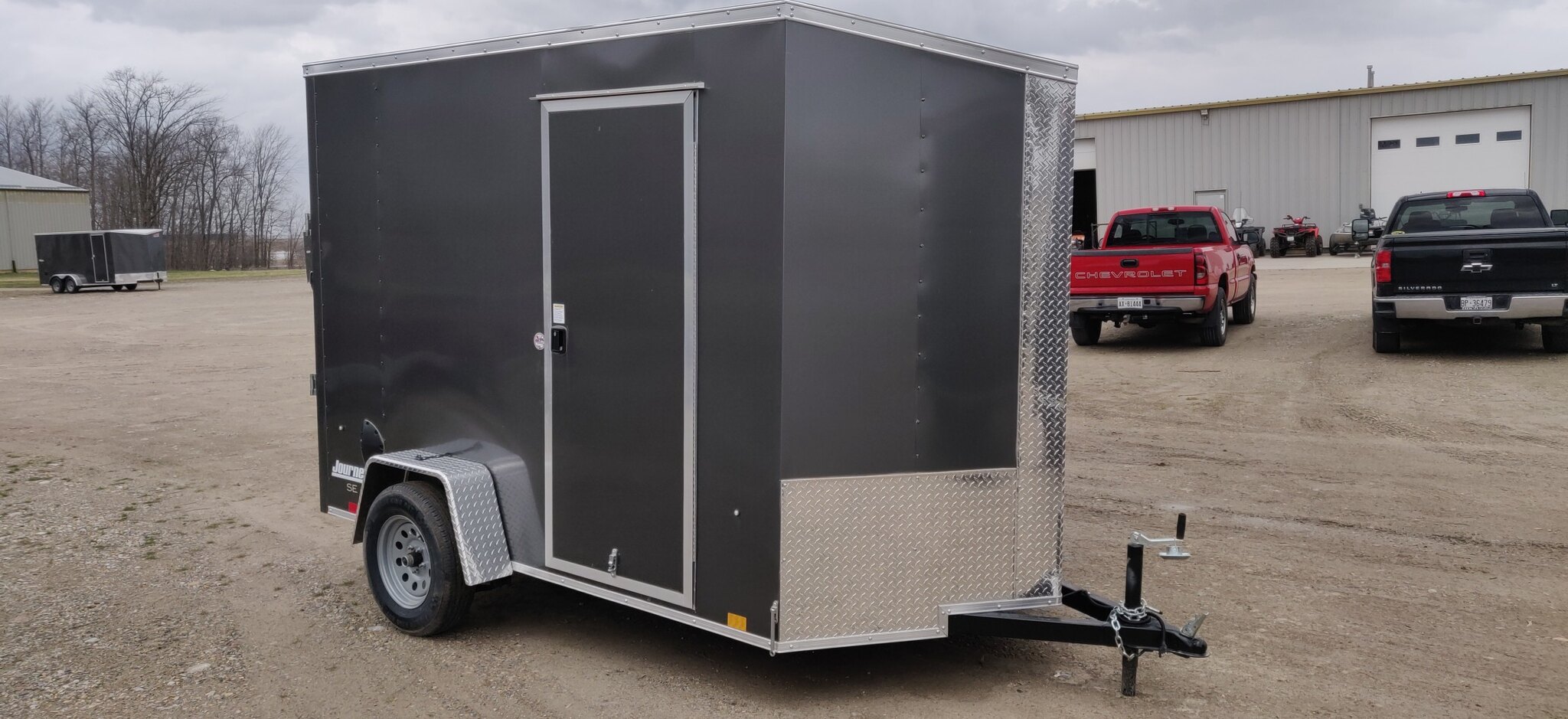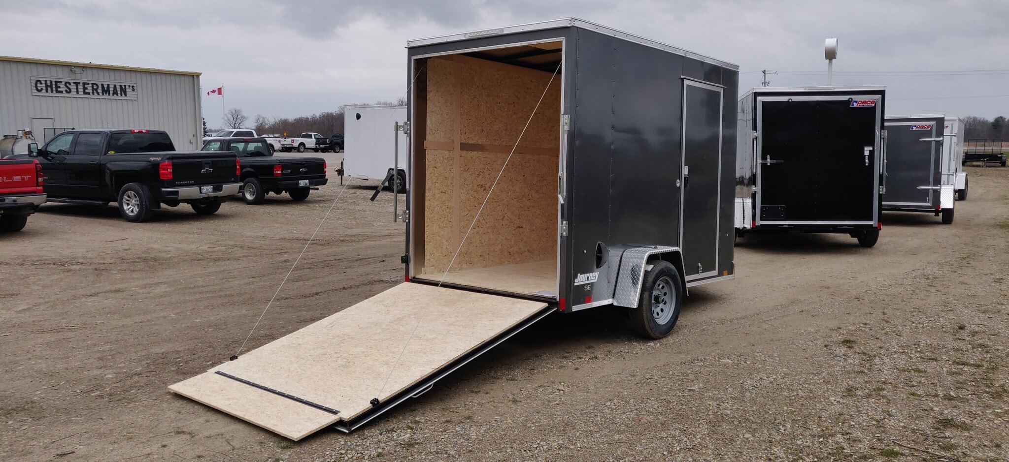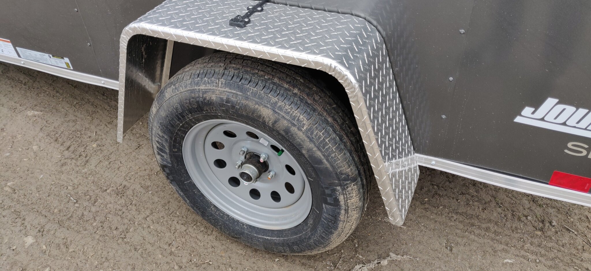 Style: Journey SE / Flat Top / 24in Sloped V-Nose Axle: Single/drop/Idler 2990 GVW Axle Type: (1) 3500 LB Spring w/ Superlube Hubs Tire: (2) ST205/75R15 5 Lug Radial Rim: (2) Silver Mod Main Frame: 2x3 Tube w/ZXMs 16in on center Main Frame: Undercoated Coupler: 2 inch ball Hitch: 2 Piece Jack: 2000lb top wind w/ sand pad Vertical Post: 84-3/4in VPH (\12\" of Height = 84\" IH) Sidewall: Z-Post/16in centers/24in sloped v-nose Roof Bow: 1 x 1-1/4 semi crowned tube 24in centers Floor: 3/4in high performance Wall: High Performance Ceiling: None Exterior Metal: Screwless w/ Screwed Seams and Coloured Matching Screws where applicable Exterior Metal: 0.030 Charcoal Front Nose: ATP 0.025\" Embossed Stoneguard: 24in High ATP 0.025 Embossed Fender: ATP Jeep Style Roof: 1 Piece aluminum Roof: 16in wide 2.7 Lauan Ridge Board Rear Hoop: Same colour as trailer Top Trim: 2-1/2in Bottom Trim: 1-1/2in License Plate Bracket: Molded Plastic Rear Door: 150 Series ramp door / spring assist w/ (2) Zinc bar locks and large J-Trim w/ Drip Rail above door Door Accessories: 12in x 3/4 High Performance Ramp Extension Side Door: 32w x 74h C/S F/L w/Wire hold back start 16in from front and drip rail above door starting 16in from front Vent: (2) Sidewall flow through vents (Black) Dome Light: (1) LED Dome light centered 12 Volt Switch: (1) C/S Rear Cable: 4-way Clearance Light: 3/4in Bullet LED Clear Lens License Plate Light: Yes Tail Light: (2) LED Clear lens slimline