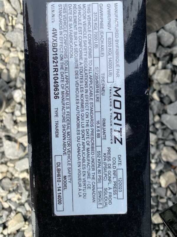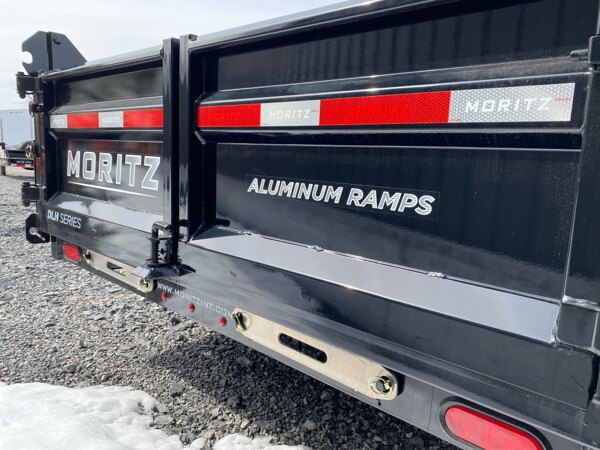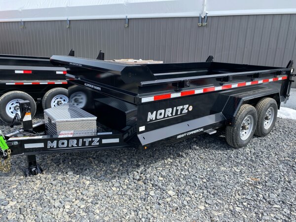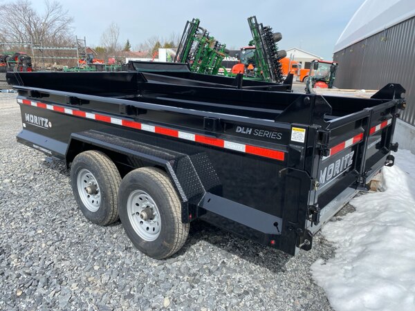 Externalspecs: 14\' long bed x 81\" wide hydraulic dump trailer with\ntandem 7000 lbs torsion flex axles, 8\" i beam main\nframe, tarp and roller kit, aluminum slide in ramps,\nheavy duty scissor lift system, double acting pump with\n110v inverter charge kit, barn doors / tail gate design