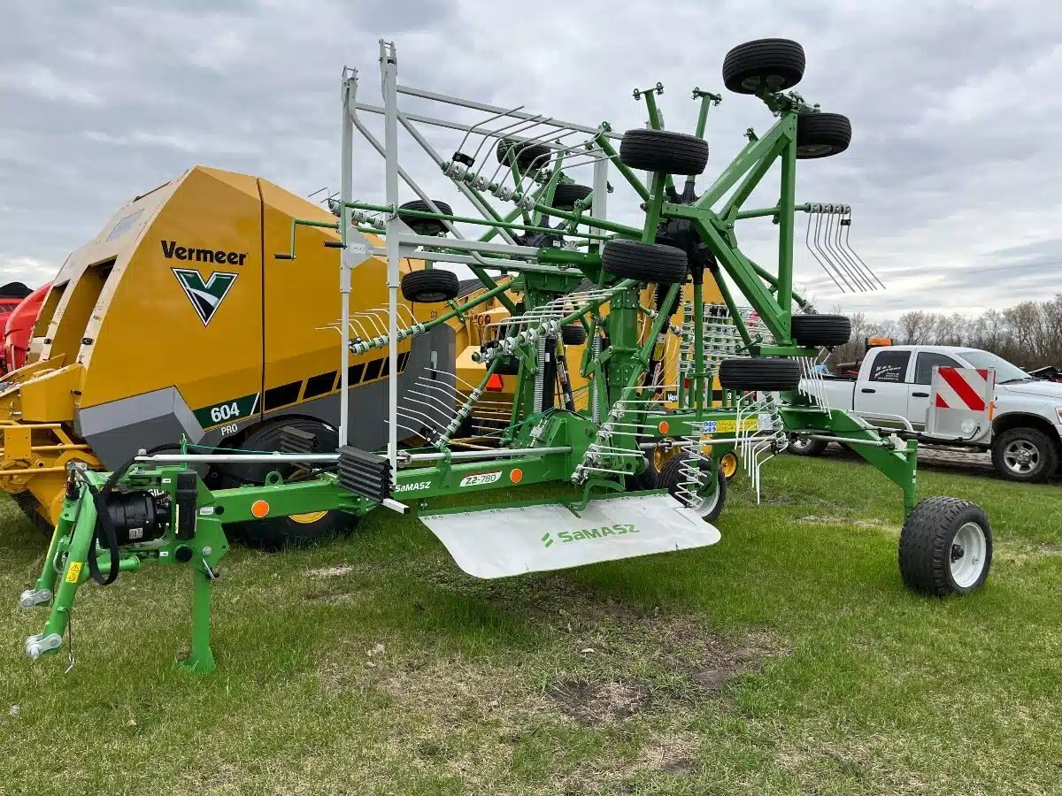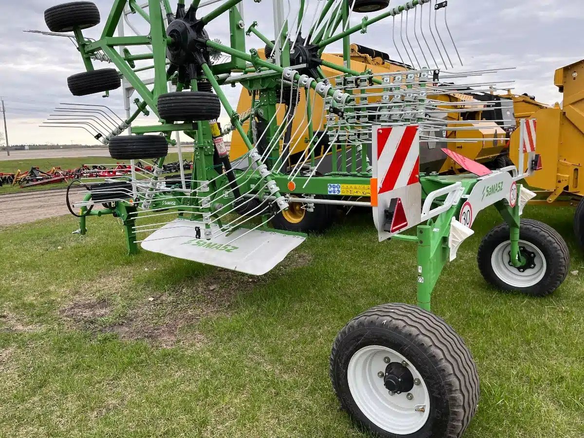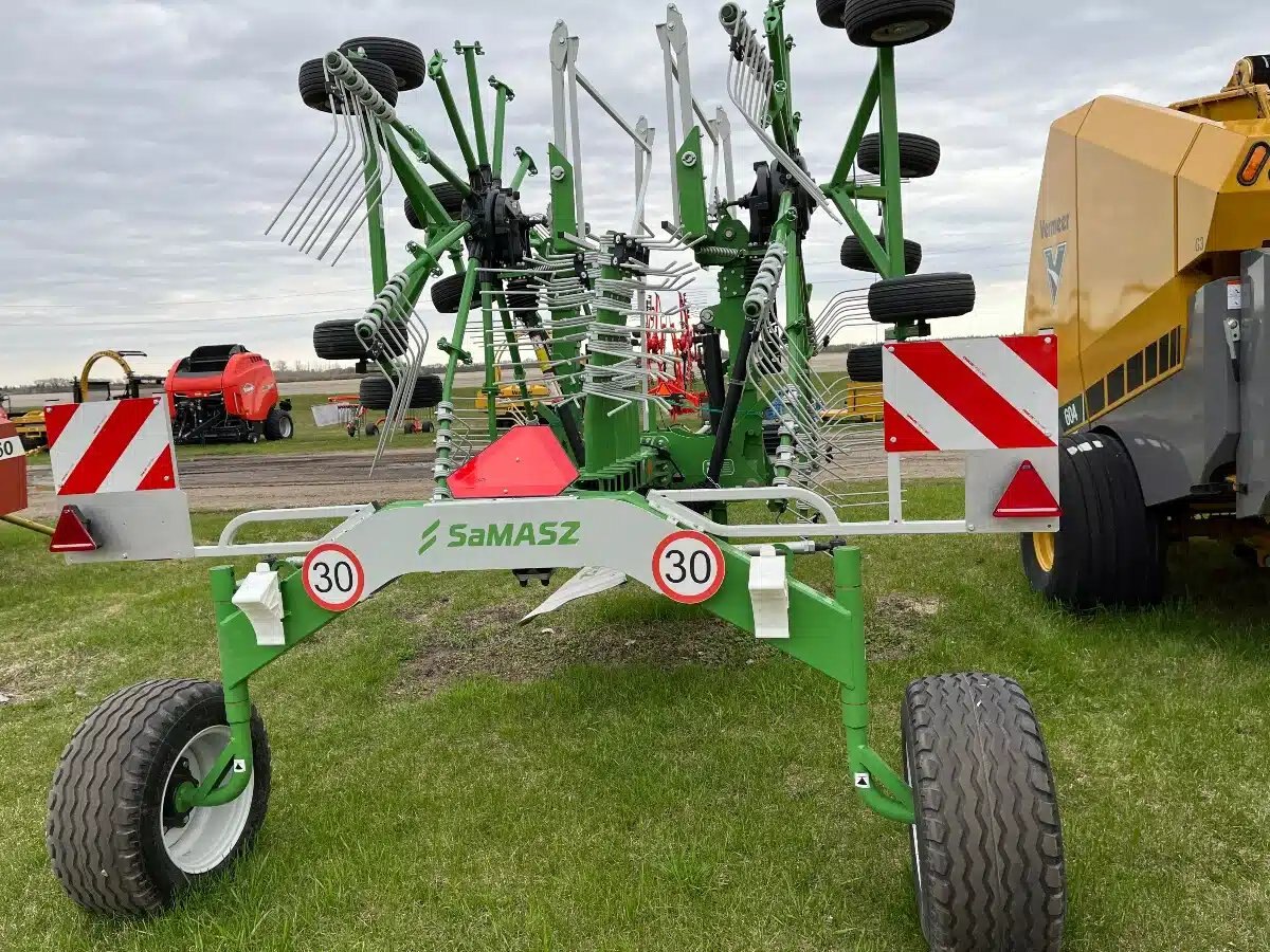 Working width 7.2- 7.6 m. Wide rear wheels, foldaway guards, mechanical lock for transport and headlands, tandem chassis ensures ideal ground following. Anti-loss tine protection, additional height adjustment for soft or firm fields. Forced steering system allows the machine to follow tractor track. Call for more details and price