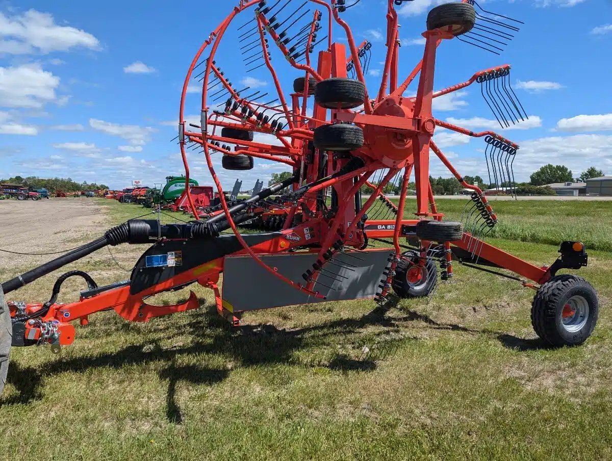 2024 Kuhn GA 8131 Twin-Rotor Rotary Rake. 540 PTO, Max working width 26'3". Lighting Kit, Rotor Flotation. Wheel Set 11.5/80-15.3. The GA 8131 central-delivery rake, with high production and excellent raking cleanliness, creates the ideal windrow for forage chopping and making round or large square bales.
