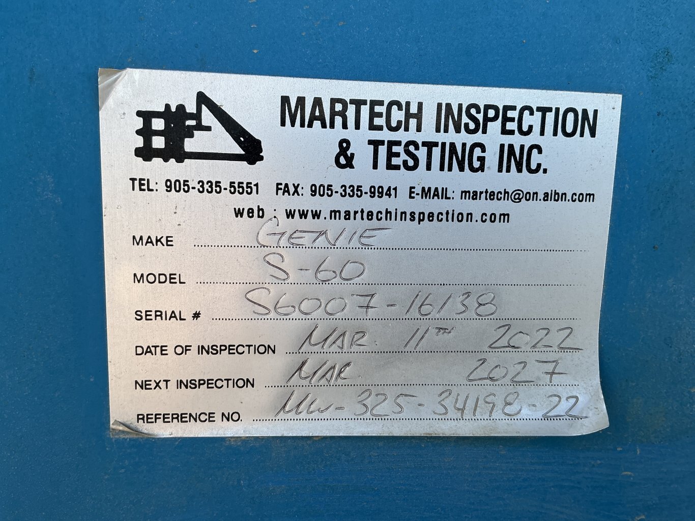 2007 Genie S-60 straight boom. This boom lift has a platform height of 60 feet giving 66 feet working height and 40 feet outreach. 4WD driveline and powered by a Deutz diesel engine. Machine weighs around 21,500 lbs. Vaild structural till mar 2027 Hour meter shows6695. Located in Maxwell Ontario.