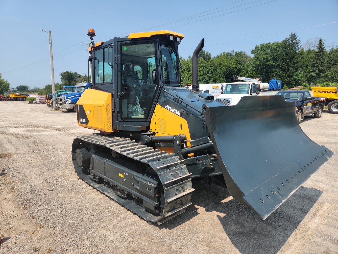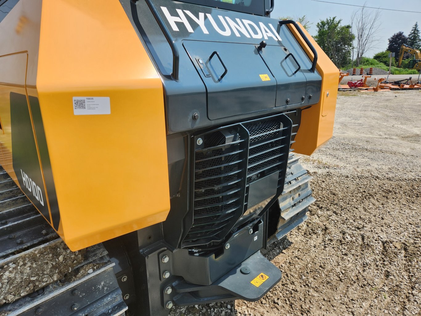 BRAND NEW Hyundai HD100 dozer, 23589 lb. operating weight, Hyundai 4 cylinder engine with 122 gross horsepower, 8" touch display with audio, 2D Smart Blade Control, Beacon light, Hi-Mate Remote Management System, Rear view camera, LED lights, 20" track shoes, Towing drawbar, 8'11" blade width with 2.9 cubic yard capacity, 3 year/3000 Hour Warranty