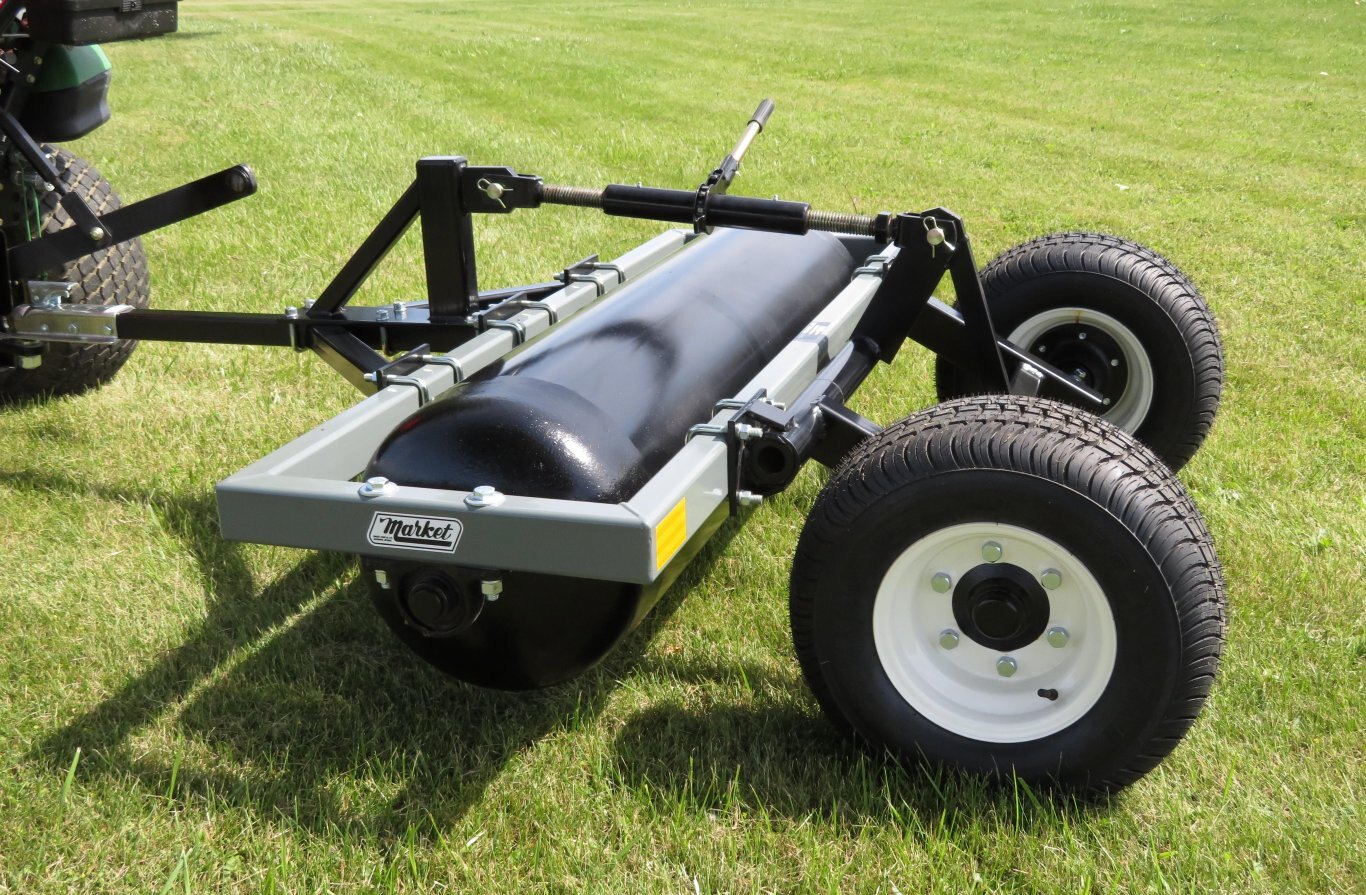Rolling greens helps suppress diseases such as dollar spots, anthracnose & microdochium patches. Rolling greens reduces turf stress for a healthier green, a smoother putting surface & increased ball speed. Standard features include a ratchet jack for raising & lower the transport wheels, a 2" ball coupler, 1-1/2" shaft & bearings. (An optional hydraulic cylinder is also available) The powder coated dark grey roller frame is accented with a black heavy duty 16" steel roller, tongue & wheel kit. The rollers are equipped with 2 filler ports for adding and draining water. WEIGHT (empty).....................575 LBS. WEIGHT (filled with water).... 950 LBS. |