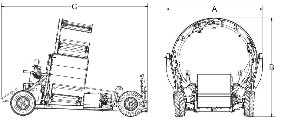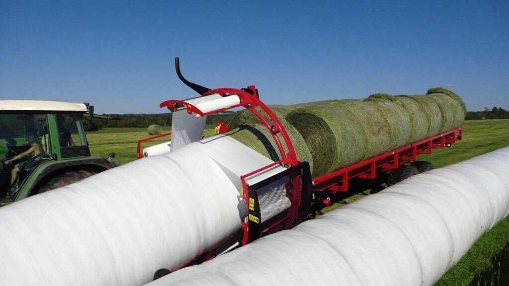 The high-performance WRAPTOR™ is the combination of a self-loading trailer and an in-line wrapper. When labor is hard to fi nd or you need to do things quickly, this all-in-one system allows you to do the transportation and wrapping with only one operator and one tractor. The WRAPTOR™ is the ultimate system for loading, transporting and wrapping. Designed for collecting wet or dry hay, it offers the fastest performance on the market.The trailer collects and transports 14 bales (4 ft × 4 ft.) at a time and attaches to the wrapper without additional equipment. The remote control offers the possibility to do everything from the seat of the tractor. |