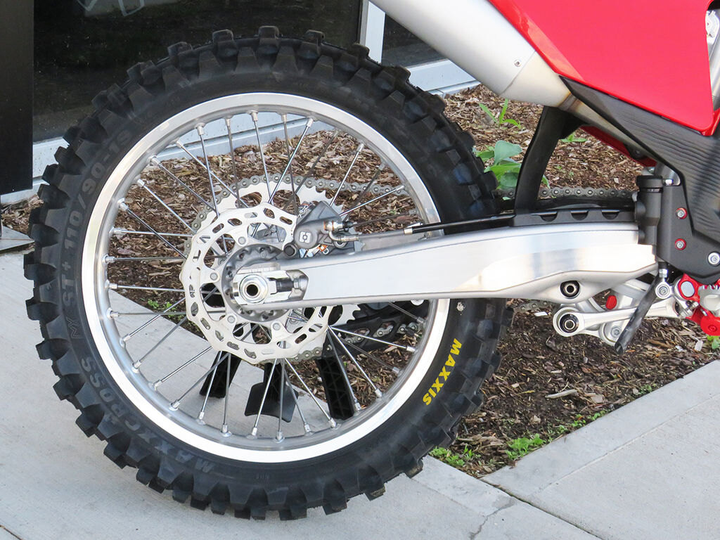 MOTORThe motor that does it all is re-designed for 2024! Continuing to pump out plenty of free-revving power, our engineers' main focus was on making the 350cc DOHC motor help enhance overall handling. They achieved this by tilting the motor backwards in the frame by two degrees for improved anti-squat behavior, which leads to an even greater level of comfort and stability when compared to the outgoing generation. Nice work, guys!