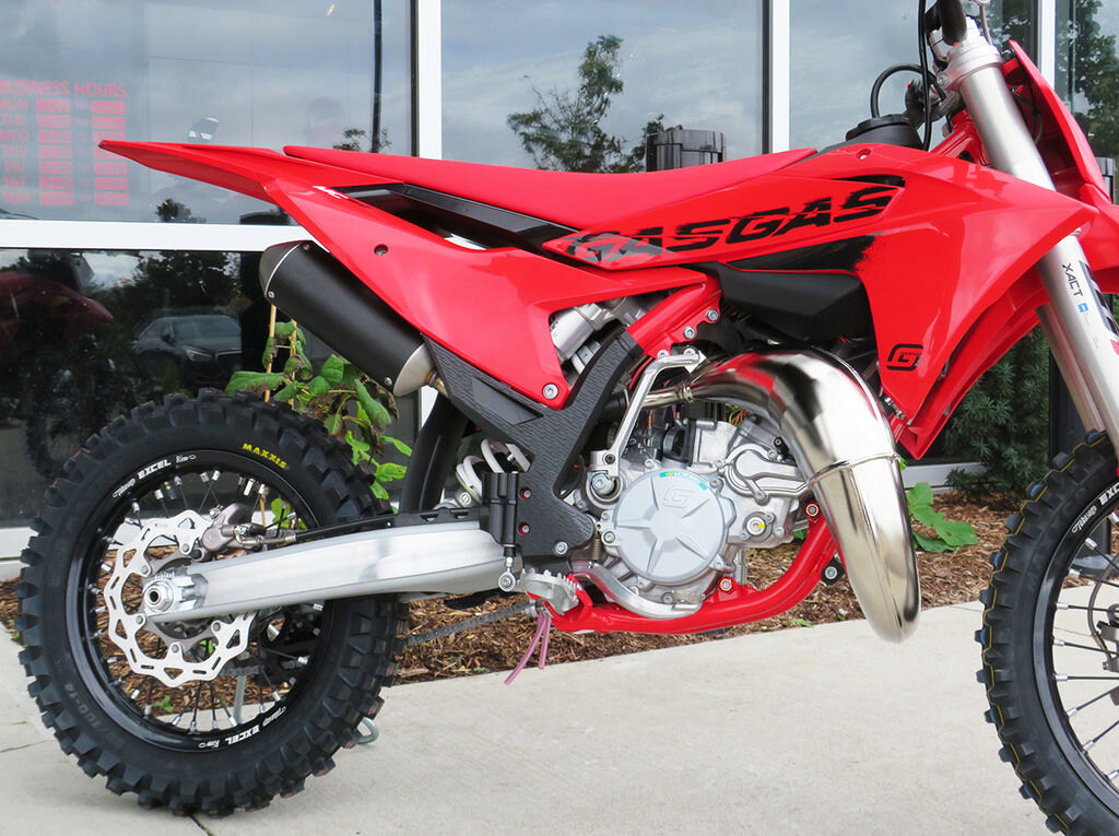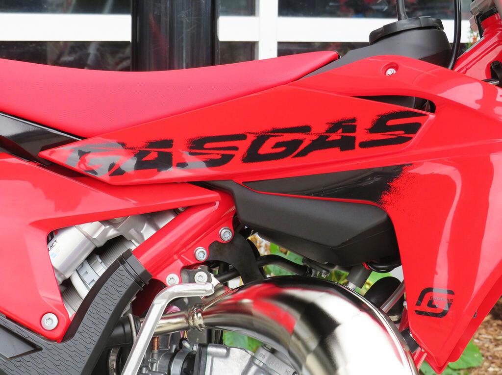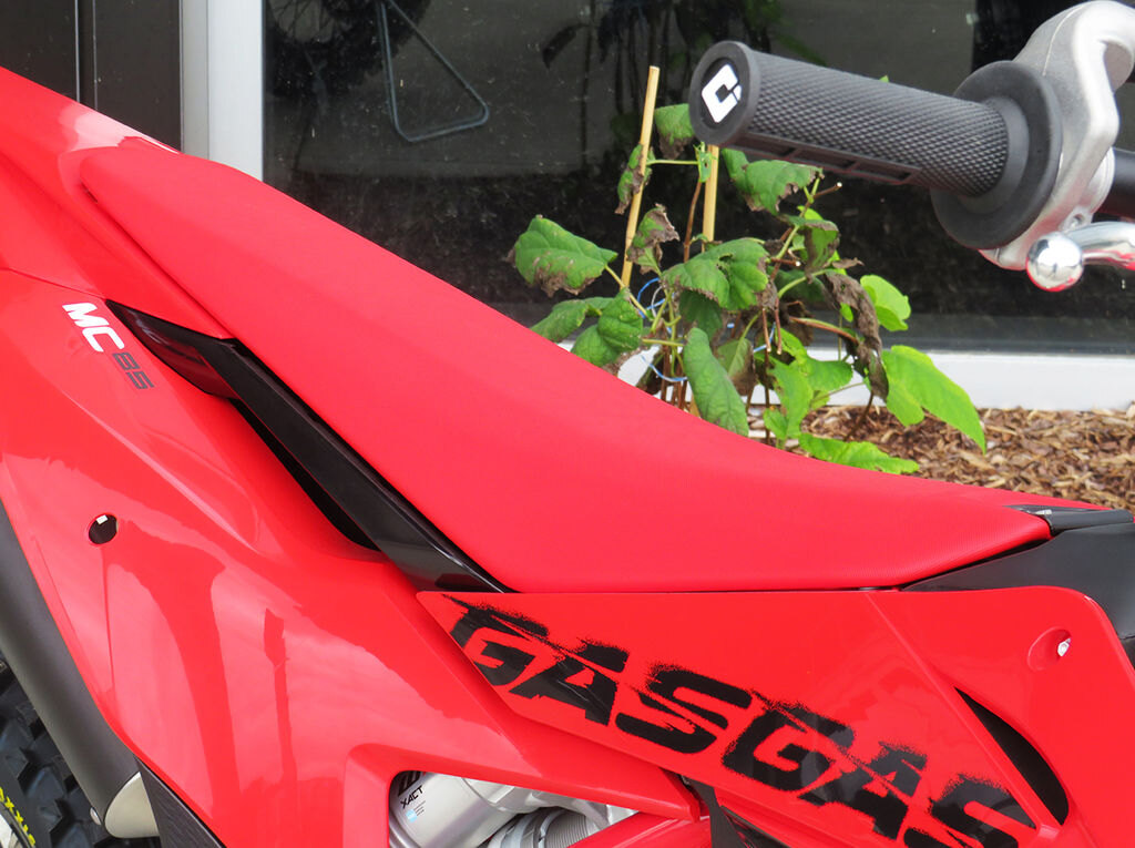 HANDLINGKnowing how good the frames are on the full-size GASGAS motocross bikes, our clever engineers set about transferring all the good stuff over to the new steel frame on the MC 85. We\'re talking straight-line stability, agility in the corners, and just the right amount of flex for maximum comfort. And it\'s safe to say that the end result is a huge step forward from the outgoing bike. Even the red frame protectors are new. Instead of a smooth finish, they now have a textured surface to help kids grip the bike better with their legs, which in turn helps to reduce fatigue.