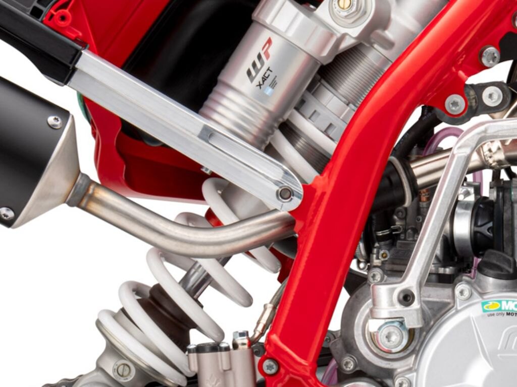MOTORHang with us, there's a lot going on with the MC 85 motor for 2025! It may look familiar, but there are plenty of important revisions that really change how this little ripper performs on track. Together, a new cylinder head, spark plug, and ignition boost power and torque in the low to mid-range while updated jetting settings and a new exhaust make sure the bike still sings when up high in the rev range. The motor is now positioned in the frame a little differently as it's rotated backwards three degrees from the same mounting point at the swingarm. That might not sound a lot, but this really helps distribute the weight of the motor to balance the bike out and creates a much more engaging ride. Finally, thanks in large part to the new components and a revised manufacturing process, the motor is 120g lighter than the old generation.