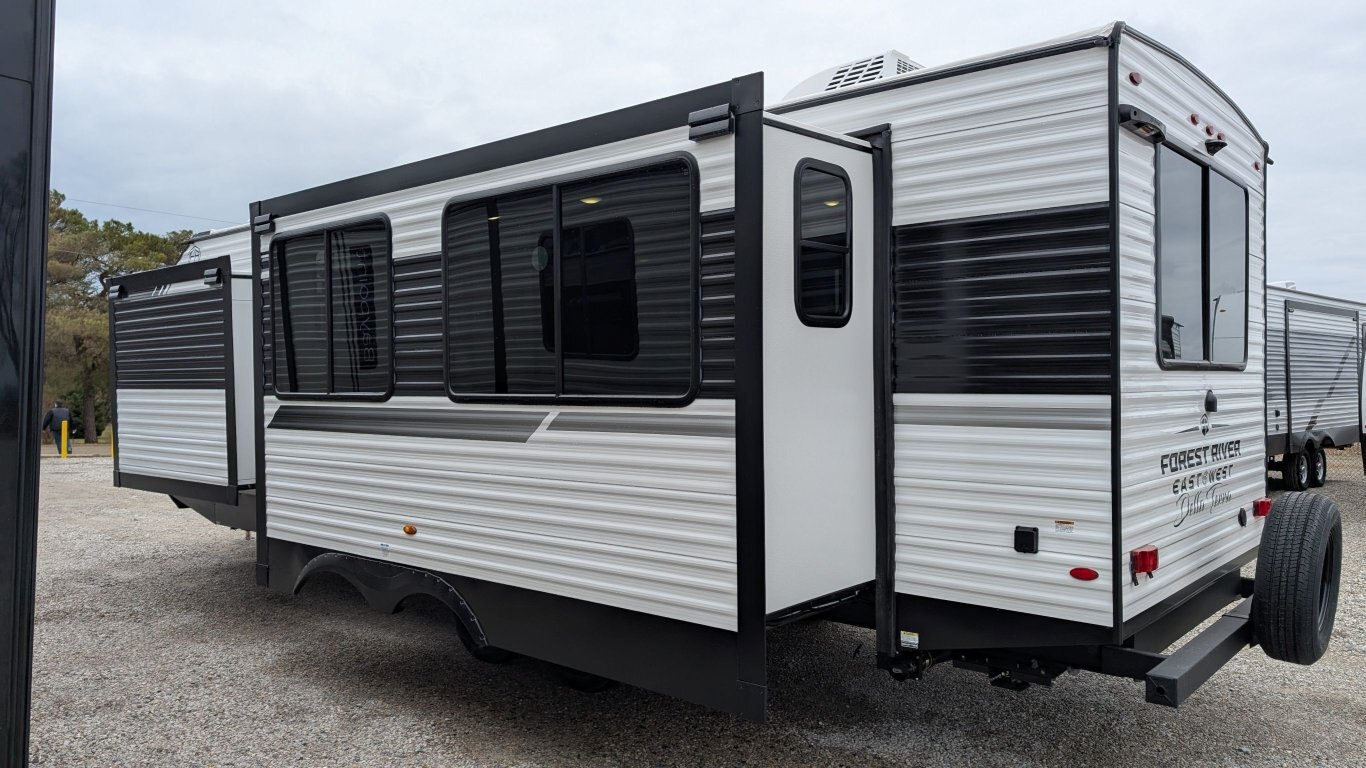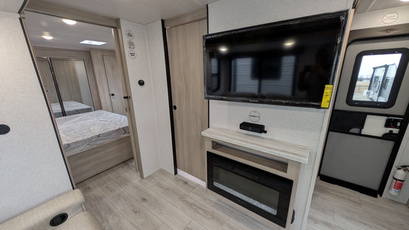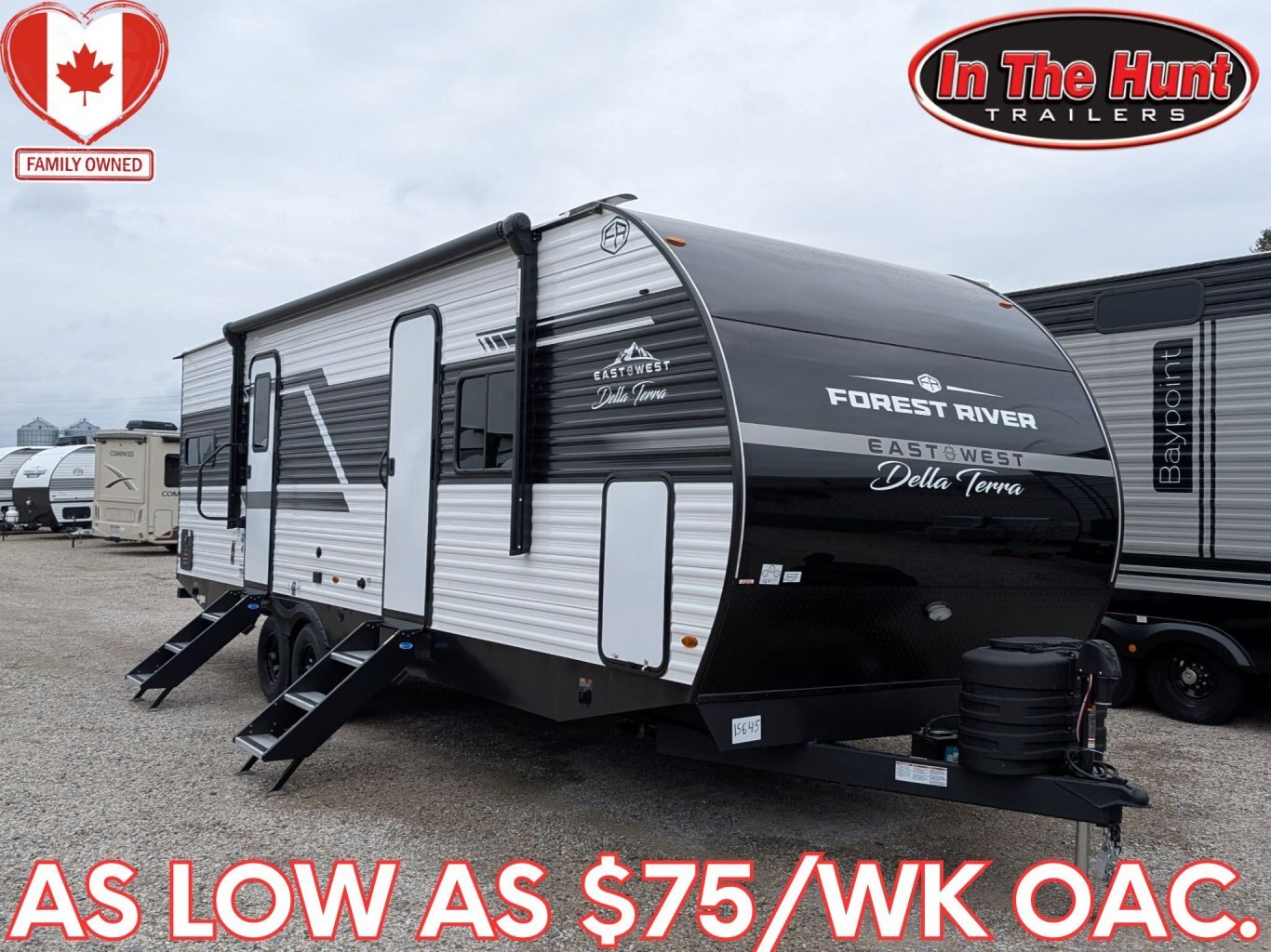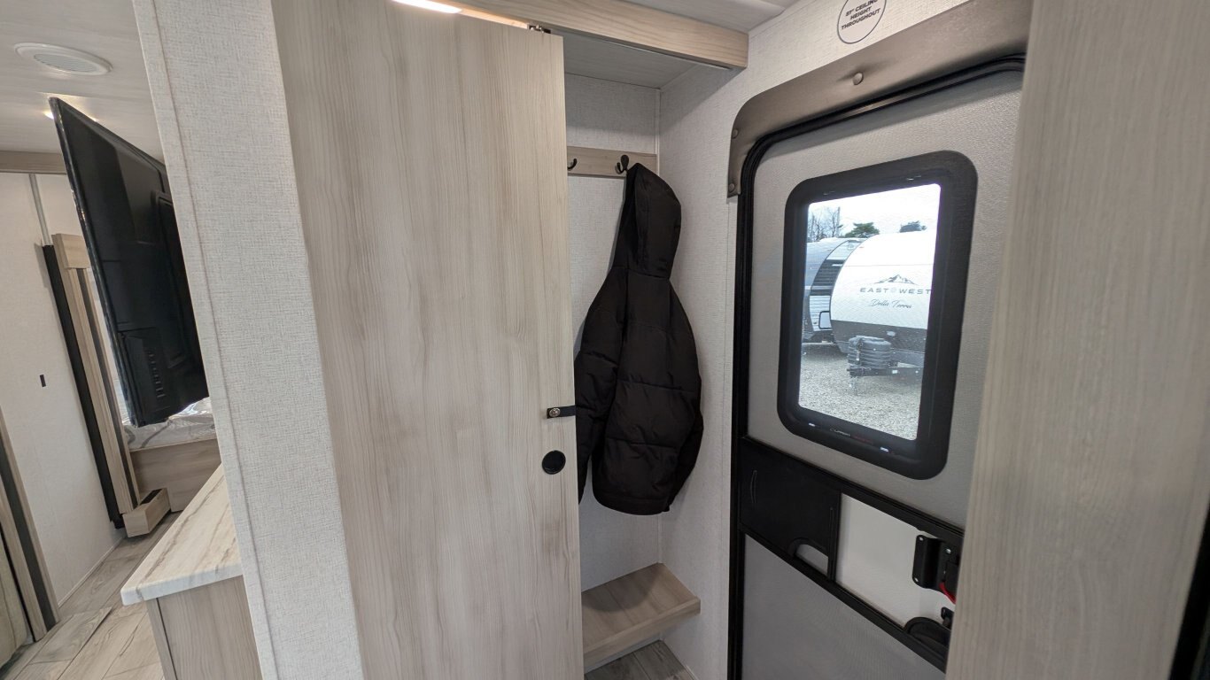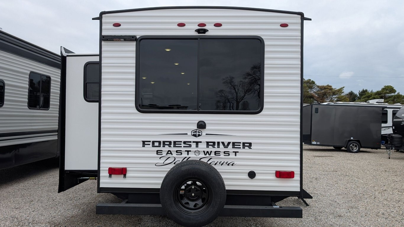 REG: $52,995 SALE: $45,995 The 2025 East to West Della Terra 263RK travel trailer is designed for comfort, convenience, and adventure. It features an 81” interior height, a king-size bed, and an upgraded interior design package featuring Odali Linen interior decor. Financing available for as low as $95/week OAC. This unit features the following options: The Explore Comfort Package includes a 10.7 cu. ft. 12V refrigerator, 3-burner range with oven, built-in fireplace, seamless pressed countertops, porcelain foot flush toilet, and a 35,000 BTU furnace. Enjoy large tinted picture windows, USB charging stations, LED lighting, and a solid bedroom door. The Adventure Outdoor Package enhances functionality with a universal docking station, tankless water heater, power awning with LED lighting, outside shower, backup camera prep, solid entry steps, solar prep, and an RV grill quick disconnect. It also includes a black tank flush, power tongue jack with LED light, and a detachable power cord. The Base Camp Package adds durability and efficiency with automotive deposition coating, heated and enclosed holding tanks, flush floor slides (no carpet), a 15,000 BTU ducted A/C with Quick Cool, and magnetic baggage door catches. Additionally, this unit comes with a 40” Smart TV, electric power stabilizer jacks, 200W solar package, Theatre seating, a free-standing dinette, and a spare tire and carrier for added peace of mind.