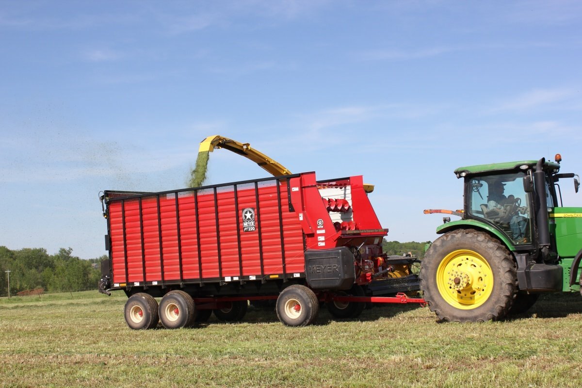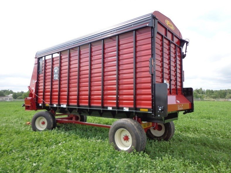 The Meyer RT200 Series Front & Rear Unload Forage Box features a 7'5" inside width, all steel frame, high speed - variable drive, HD bevel geardrive, poly floor and removable roof. Wagon, Cart or Truck Mount models are available. It offers more capacity, more speed and more options than any other forage box on the market. RT200's are available as an open top and also offer high sides, hydraulic drive and more!