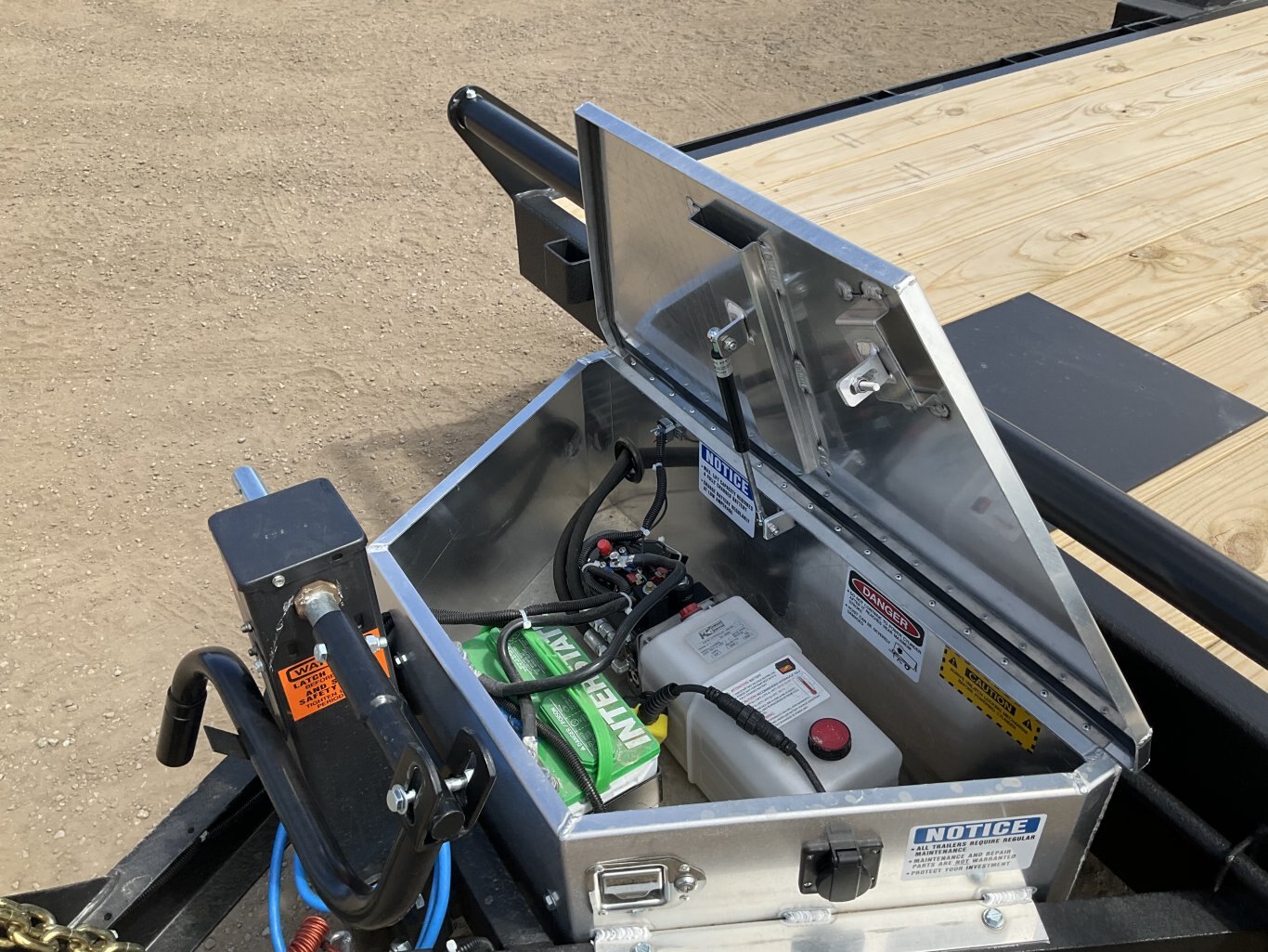 15,120LB GVWR, 2 7000LB Axles with Easy Lube Spindles and Slipper Spring Suspension, 16 Inch Radial Tires, Galvanized Rims, Electric Brakes on Both Axles, 12,000LB Drop Leg Jack, Electric Over Hydraulic Full Tilt, 3 Inch Hydraulic Cylinder, Interstate Extreme Cycle Battery, Lockable Aluminum Toolbox, 24 Inch Deck Height, Pressure Treated Wood Floor, 52 Inch Tongue Length, Stake Pockets and Rub Rails, 4 HD D-Rings, Spare Tire Mount, Rubber Mount Sealed LED Lighting, Full Sealed Wire Harness, HD Treadplate Fenders