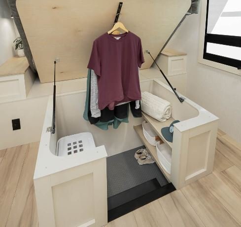 - MaxSpace Split-Level Wardrobe™ with a hanging closet and adjustable shelves under the bed, and a full floor-to-ceiling wardrobe with drawers, maximizing flexibility and storage space