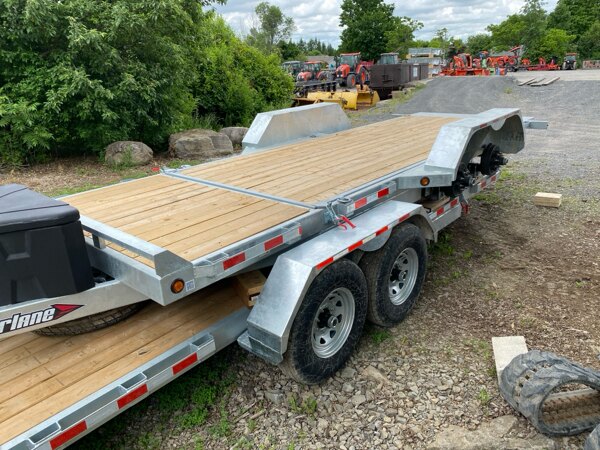 Externalspecs: 20\' galvanized low profile equipment float with 16\'\ntilt deck with dampening cylinder and 4\' stationary\nplatform, tandem 7000 lbs slipper spring axle with easy\nlube hubs, heavy duty fenders d-rings, pintle hitch,\ntongue mount poly storage box, led lights, galv rims,\nadjustable 2-5/16\" ball coupler