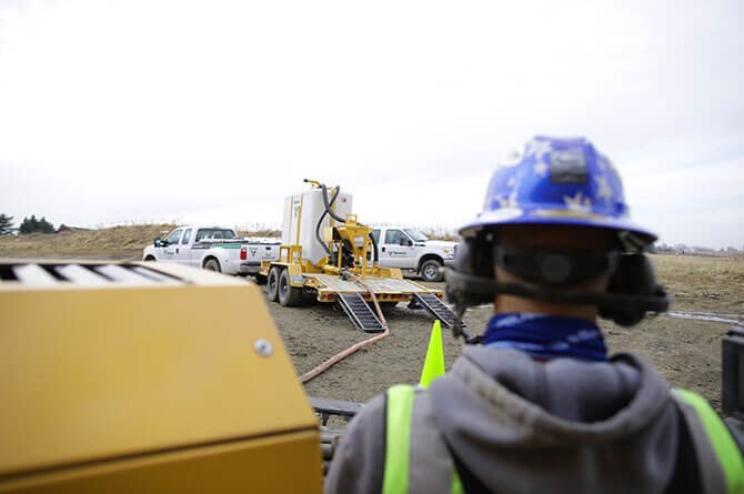| With the option to arrange your setup to meet the jobsite needs, this mix system can be configured through mounting the tank in a variety of positions related to the power unit. A single or dual tank can be paired with just one power unit, allowing for the option of more drilling fluid onsite. The narrow rectangular tank design can help maximize fluid volume and can be mounted for convenient transport and storage. Serviceability is efficient, with convenient access to the roll jets through the top of the tank. Drain your MX300 with two drainage points, activated with the opening of two easily accessible valves. With a suction hose and a wide-mouth hopper, inject your drilling additives into the system to create your right mix. The 350 gpm (1324.9 Lpm) pump flow efficiently mixes high volumes of fluid for a variety of bores - from smaller shots to large-diameter and longer-distance HDD applications in varying soil types. The MX300 mixing system pairs well with a variety of drills and is made to mix! |