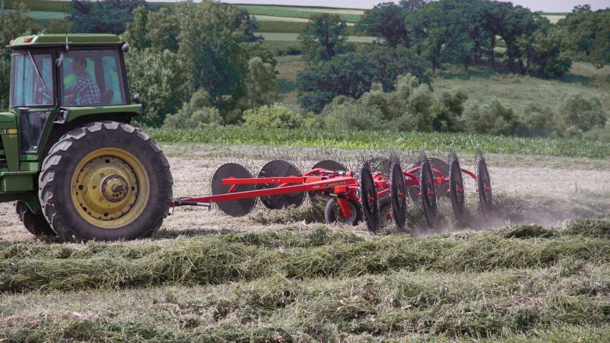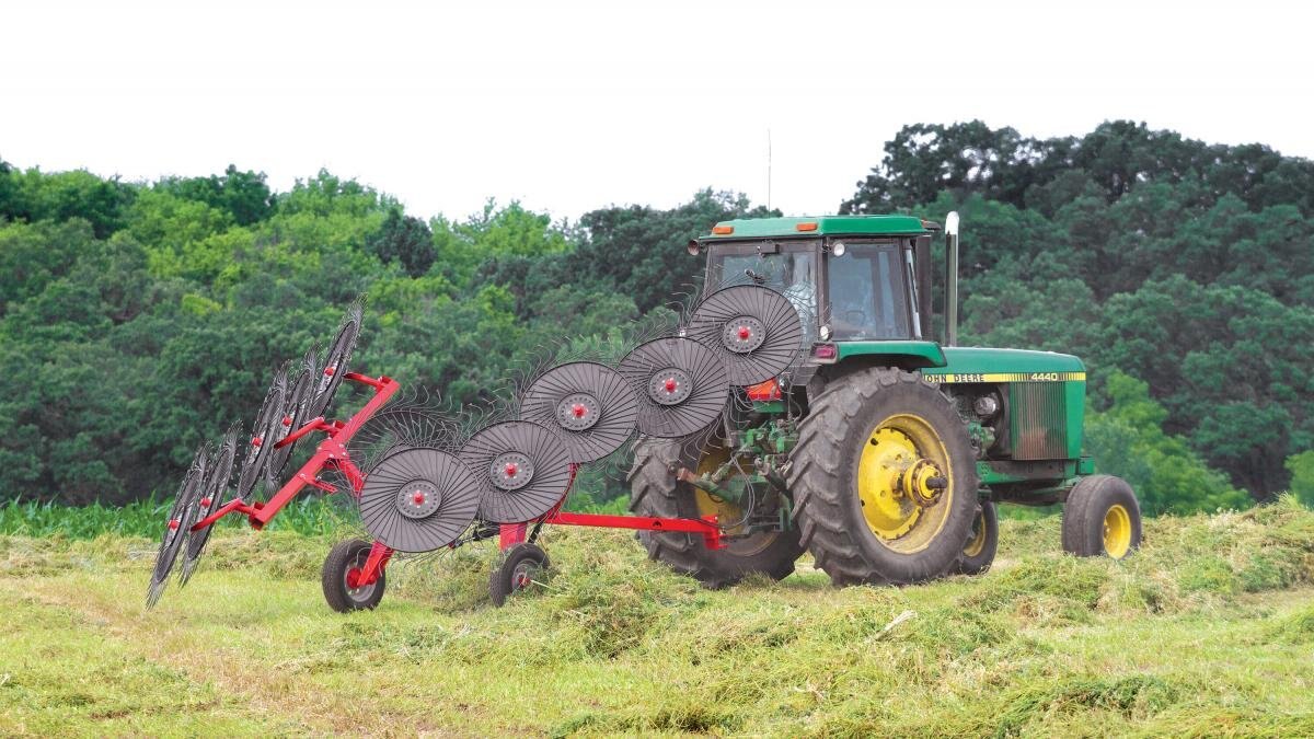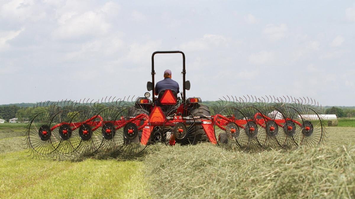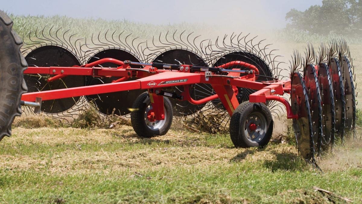 KUHN SR 50 Series SpeedRake® wheel rakes boast exceptional quality and simplicity for smaller acreage producers who don’t require the deluxe features of the SR 100 GII. Working widths range from 15’11” to 21’4,” with a standard 8-wheel configuration and an optional extension to make a 10-wheel model. The built-in mechanical rake arm flotation slots, combined with simple leaf spring flotation, result in superior terrain following without the need for a tractor equipped with hydraulic float. The fully welded frame provides outstanding reliability and ease of use. Standard single-side raking allows flexibility for ultimate crop management. |