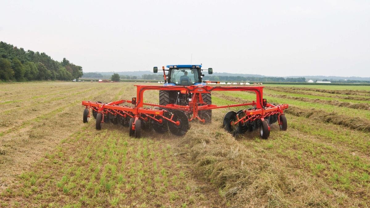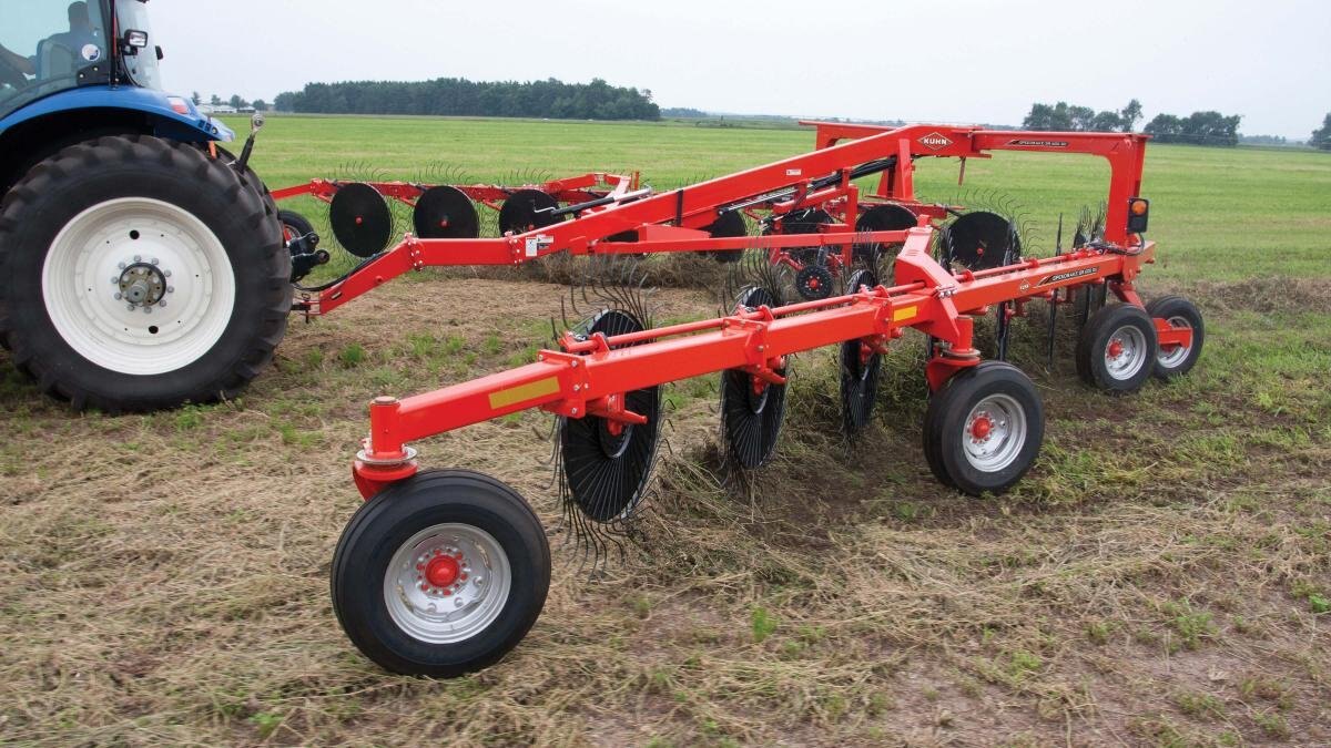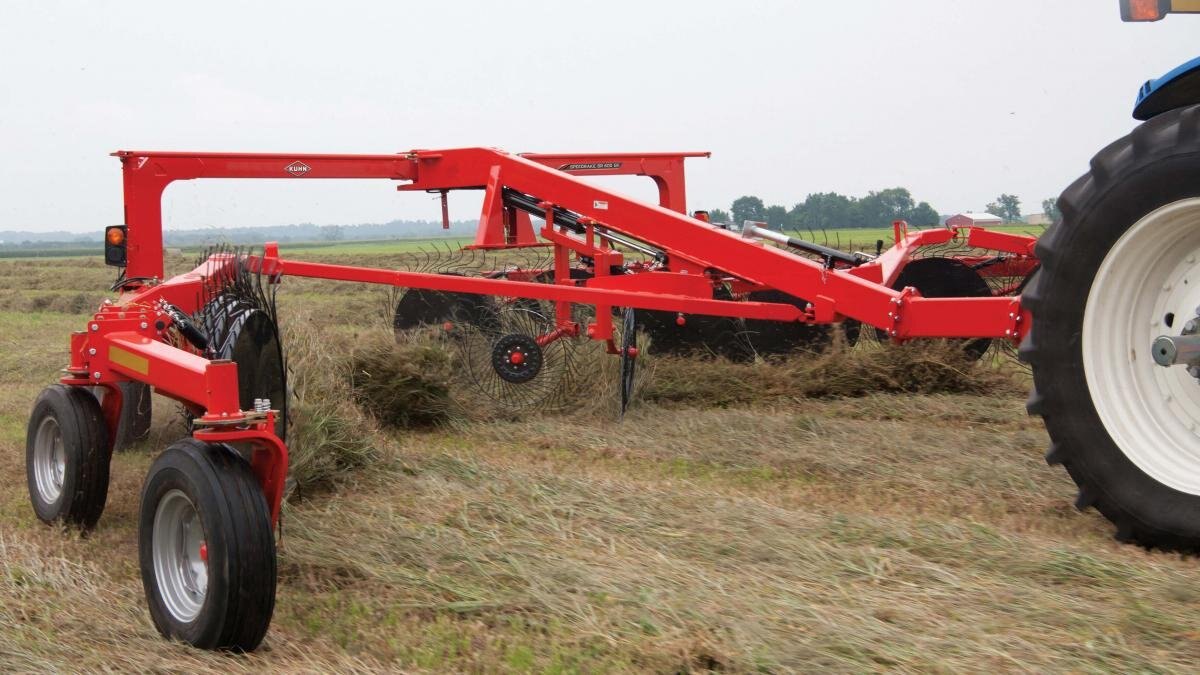 KUHN SR 600 GII Series SpeedRake® wheel rakes are high-capacity, bi-fold rakes designed to meet the needs of today’s progressive hay producers. The innovative design provides unparalleled maneuverability on the road and in the field. These rakes can turn on a dime! The SR 600 GII Series rakes provide clean raking while preserving crop stubble, as well as optimized windrow formation, for a total package that offers the ultimate combination of productivity and quality performance. |