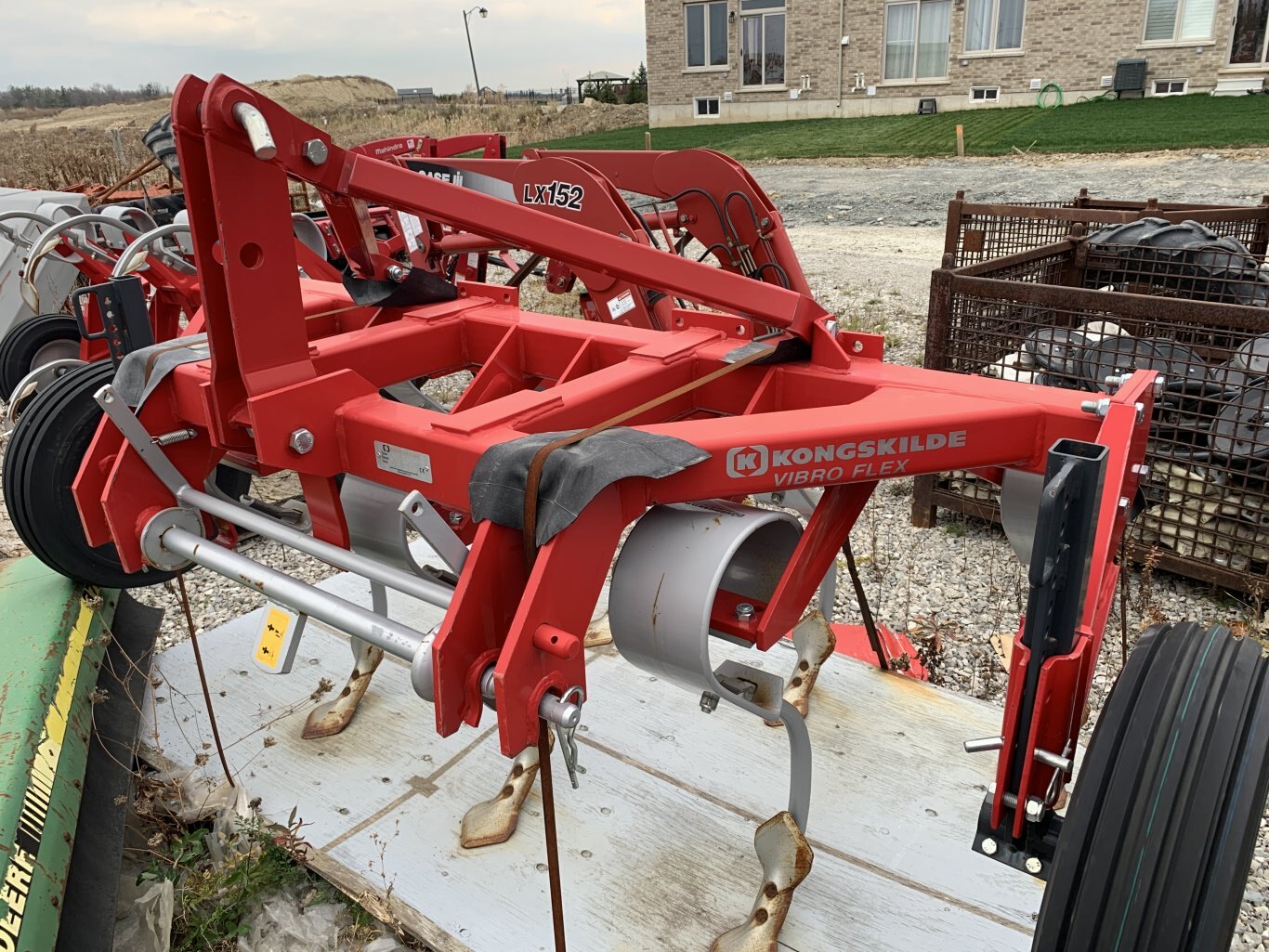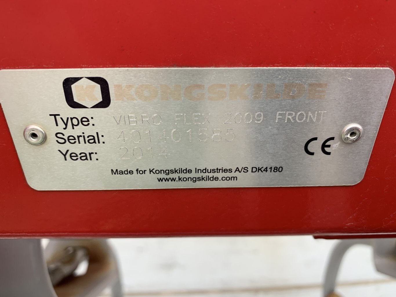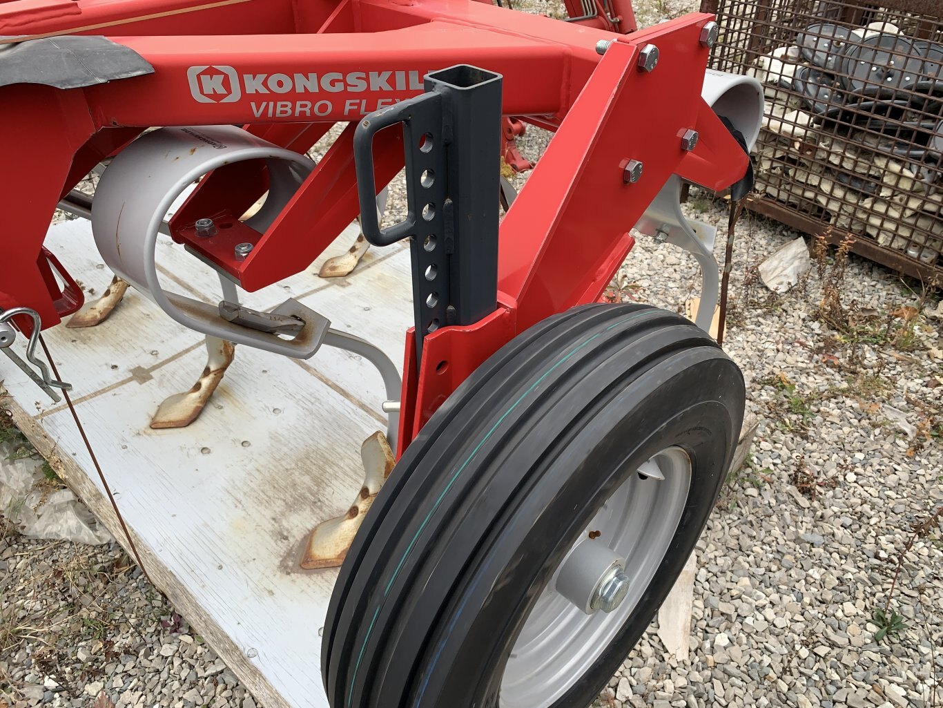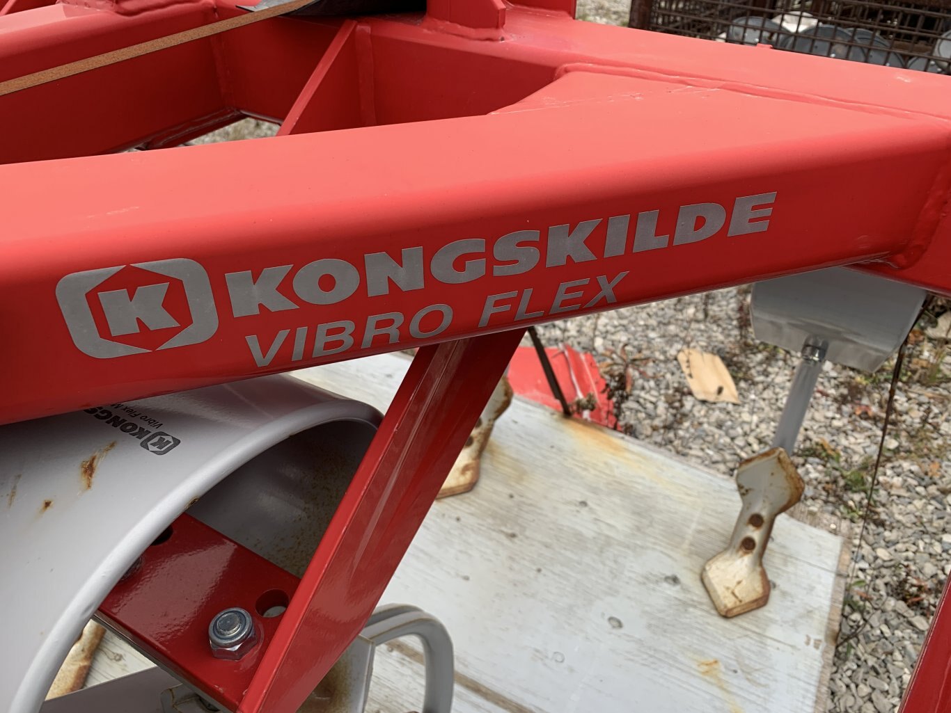 Kongskilde Vibra Flex ,Working width 2.45 Meters 8.04 ft , Transport Width 2.45 meters 8.04 ft , Max working Depth 25 cm 9 3/4 inches , 9 Tines , Spacing 27.5 cm 10.5 inch , weight 395 kg 870.93 lbs , Min Hp requirments 45 hp to 70 hp , adjustable guage wheels , this unit is new still on shipping crate , please see images small amount of weathering