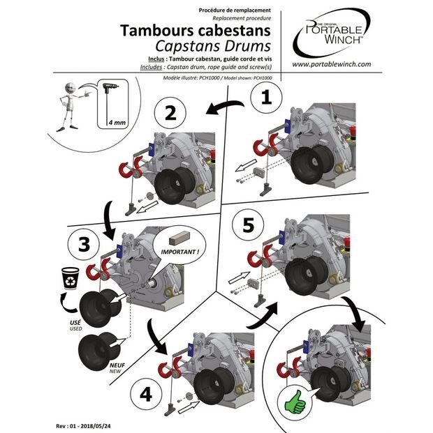 Capstan drums can be replaced on winches when worn out or in order to increase either the speed or the capacity of the winch, depending on the model.