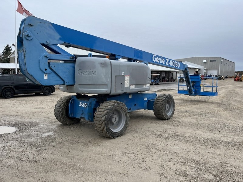 Articulating man lift, 2008 Genie model Z80/60. This boom lift has a platform height of 78 feet giving 84 feet working height and 60 feet outreach. 4WD driveline and powered by a Continental gas engine. Machine weighs around 37,500lbs.  Hour meter shows 3456.