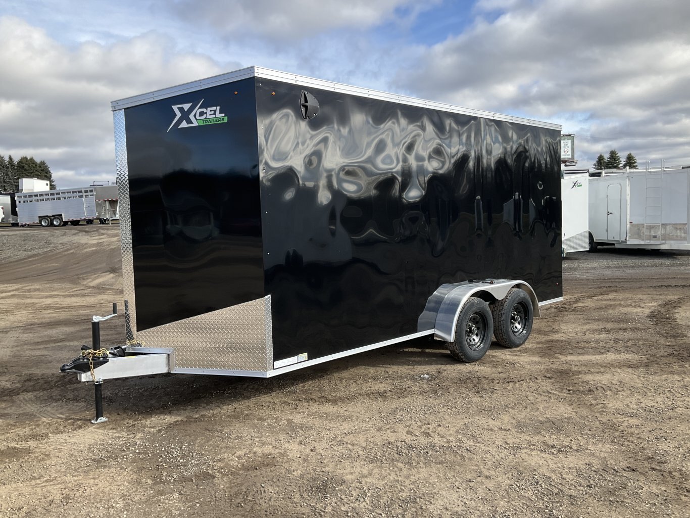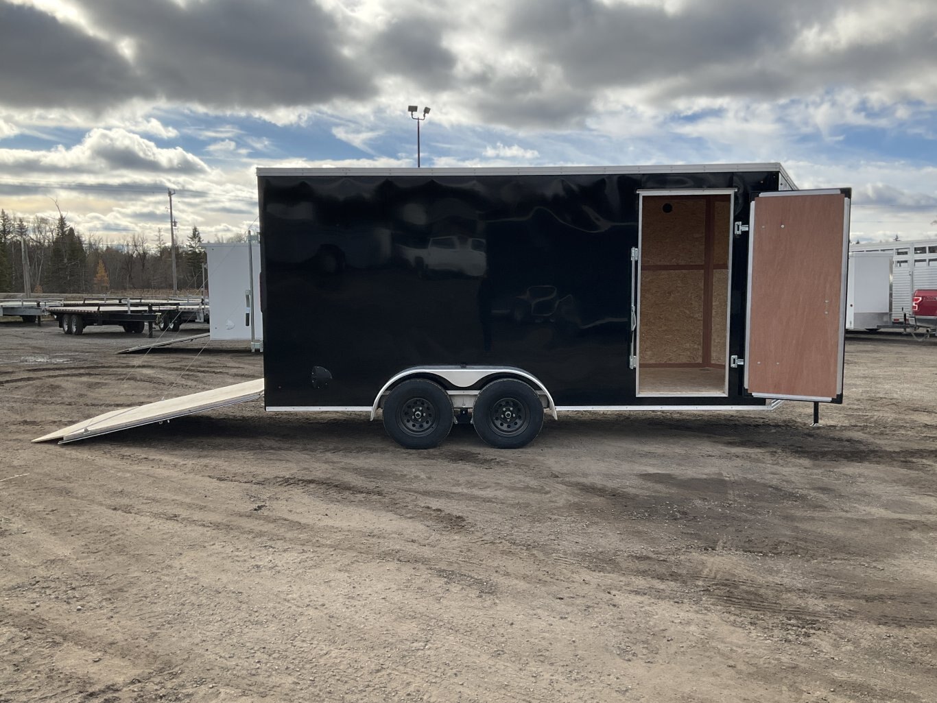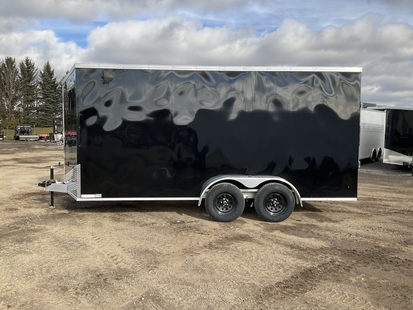 7000LB GVWR, 2 3500LB Spring Drop Axle with EZ Lube Hubs, Electric Brakes, 15 Inch Radial Tires, Electric Brakes, 2' Sloped V-Nose, 7' Tall, .030 Black Screwless Exterior, 32" Side Man Door, Rear Ramp Door with Cable Assist, 3/8" Wood Lined Walls, 3/4" Marine Rainblock Wood Floor, Seamless Aluminum Roof, 16" On Centre Walls/Floor/Roof, 2 Wall Vents, 12V Dome Light and Switch, 6 D-Ring Tie Downs, ATP Stone Guard, 2-5/16" Ball Coupler, A-Frame Tongue Jack with Sand Pad, Sealed LED Lighting