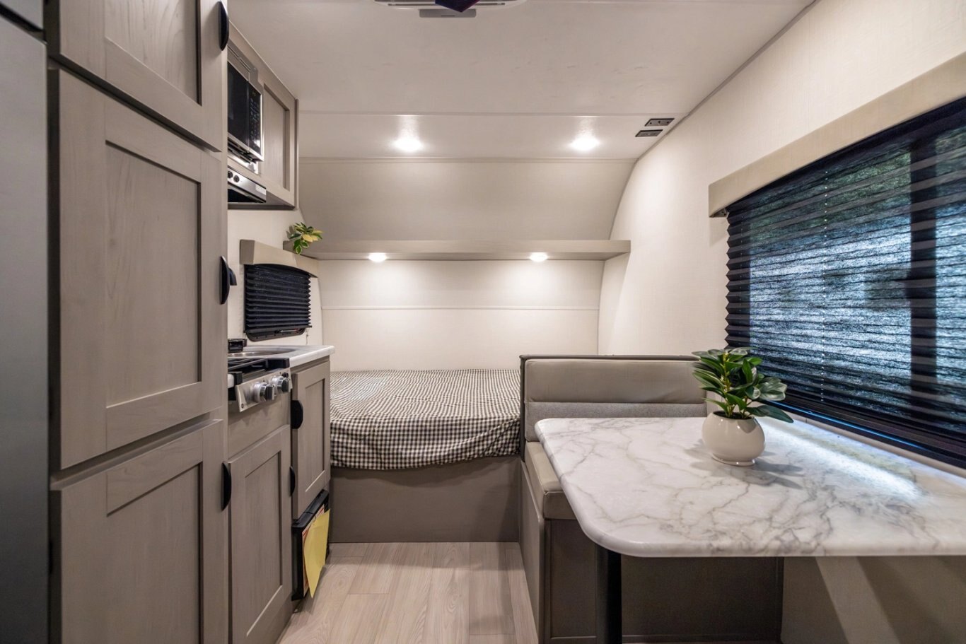 | The 16FB is the oldest floorplan offering in the 3K Series. Complete with a corner bath, rear storage, pantry, dinette (that converts into bed), and east/west front bed with jumbo pass-through storage. #CampEasy |