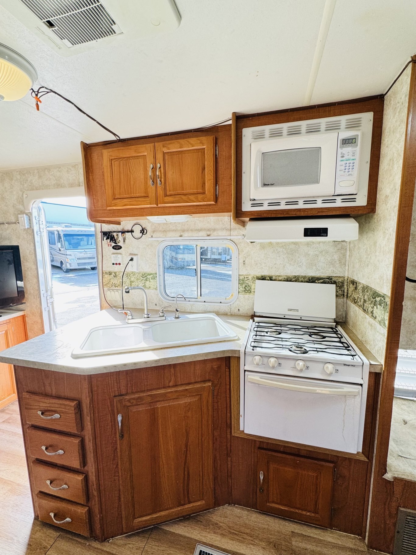 Kitchen: 3-burner stove, oven, microwave, fridge, double sink