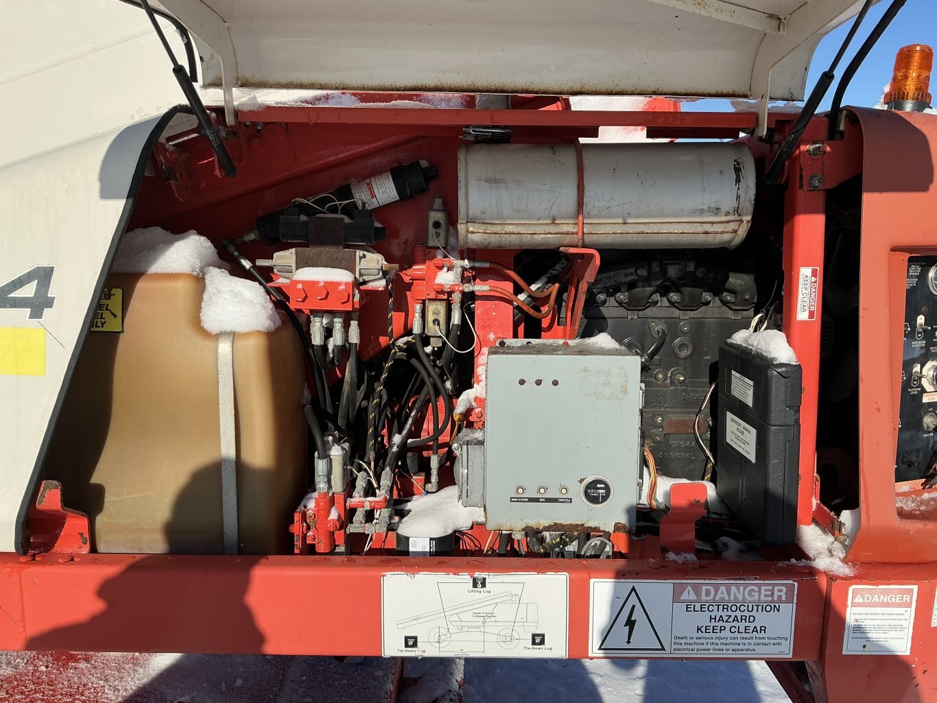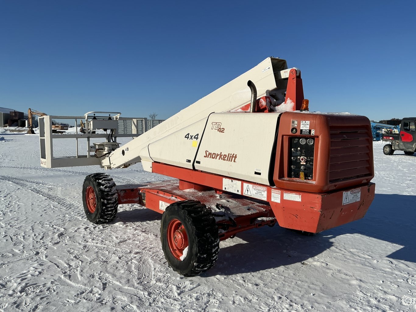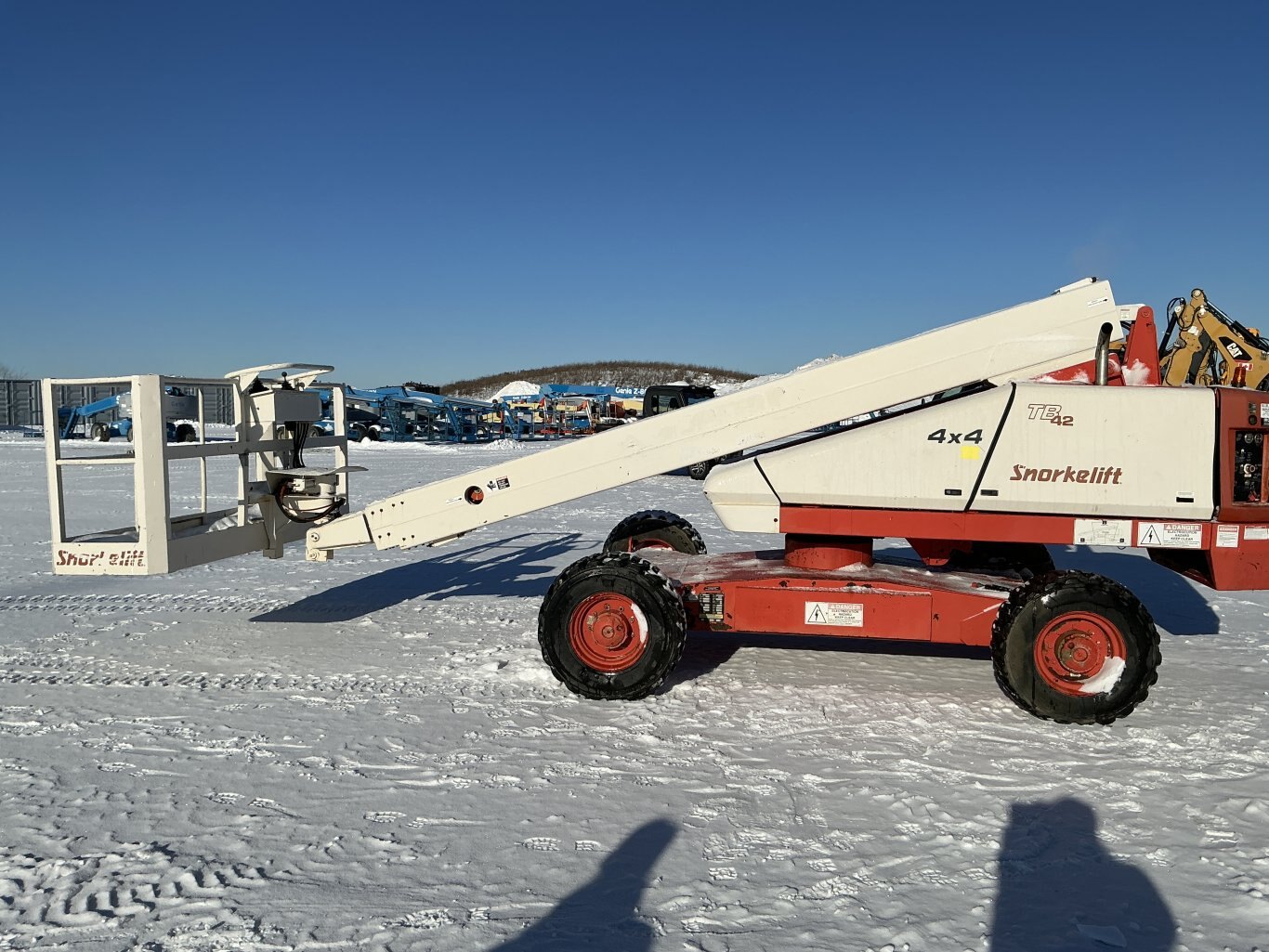 2001 Snorkel TB-42 straight boom. This boom lift has a platform height of 42 feet giving 50 feet working height 4WD driveline and powered by a Cummins diesel engine. Machine weighs around 12,500 lbs. Hour meter shows 4219.
