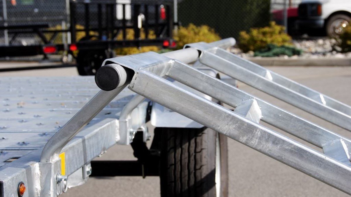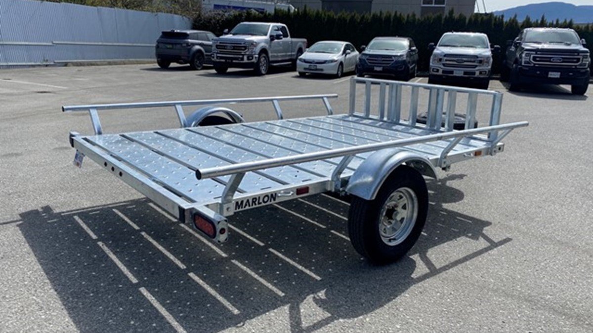 The Marlon Rat-02 Utility Trailer is the upgrade to our bestselling ATV trailer! The Rat-02 comes standard with steel floor decking with punched floor for grip! It is available in powder coated paint or galvanized finish. We have designed this trailer so that the loading ramps, hook on over the rear trailer frame for rear loading or hook onto the side bars for easy side loading of ATV's. The ends of each steel floor panel have notches cut out for securing straps. The loading ramps can be stored on the trailer in the front (pictures show storage of ramps in both front and back but that is no longer available). The Rat-02 complies with Canadian and US D.O.T. requirements.