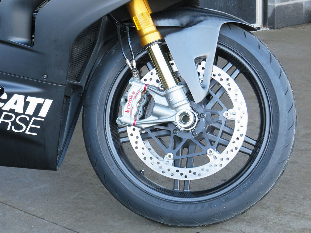 To further enhance the performance on the track and the dynamic qualities of the Panigale V4, the \"SP2\" version is equipped with high-quality 5-split spoke carbon wheels, 1.4 kg lighter than the aluminium forged ones of the Panigale V4 S.