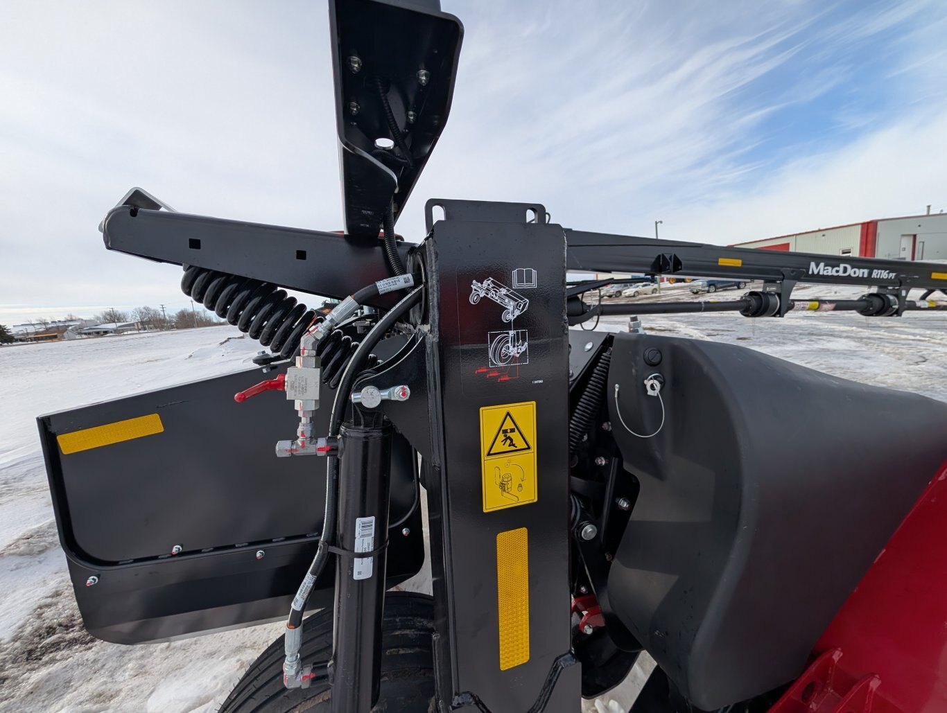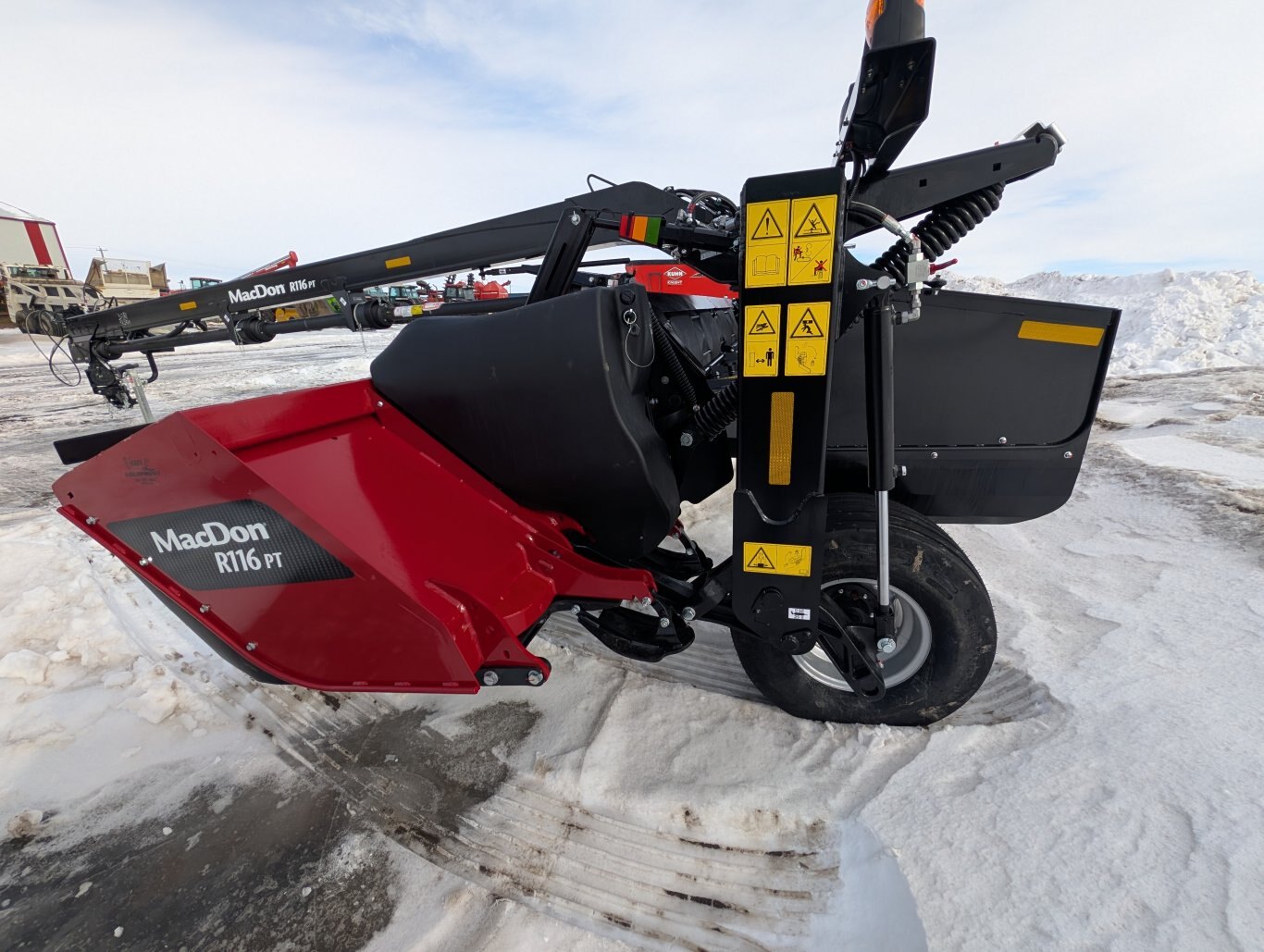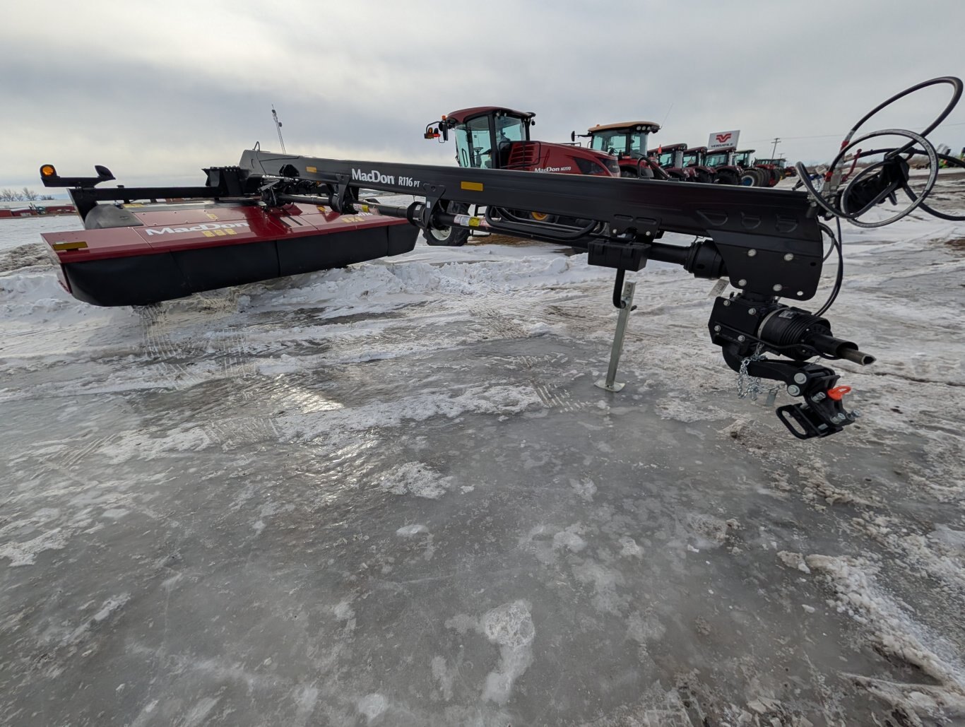 2026 MacDon R116. 16' Pull type mower/conditioner. Features forward-mounted cutterbar design and the industry's widest rolls at 129" which results in well-formed, well-conditioned windrows. Comes with a 3 year cutterbar warranty, and each of the discs features a shearpin which will disable it when contact is made that stops the disc. The disc then moves up and out of the path of the obstruction preventing any serious damage to the cutterbar. The shear pin can then be easily replaced in-field. Comes with steel inter-meshing rolls which are ideal for high volume crops where aggressive feeding through the header is required. In smooth stemmed crops, the steel roll action promotes even plant dry down by creating uniform crimps on the plant stem without bruising the delicate leaves. Extreme durability and minimal maintenance. -1000 pto -125hp min requirement -16' cutting width -10 discs, 2 blades per -6240 lbs -Requires 3 remotes with the hydraulic header angle adjustment option which is included -Intermeshing steel rolls
