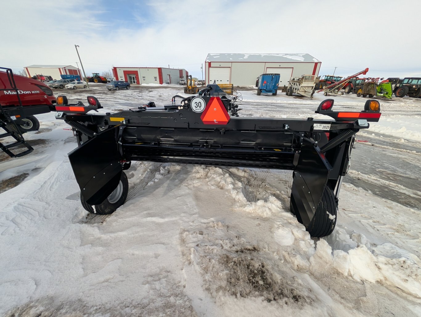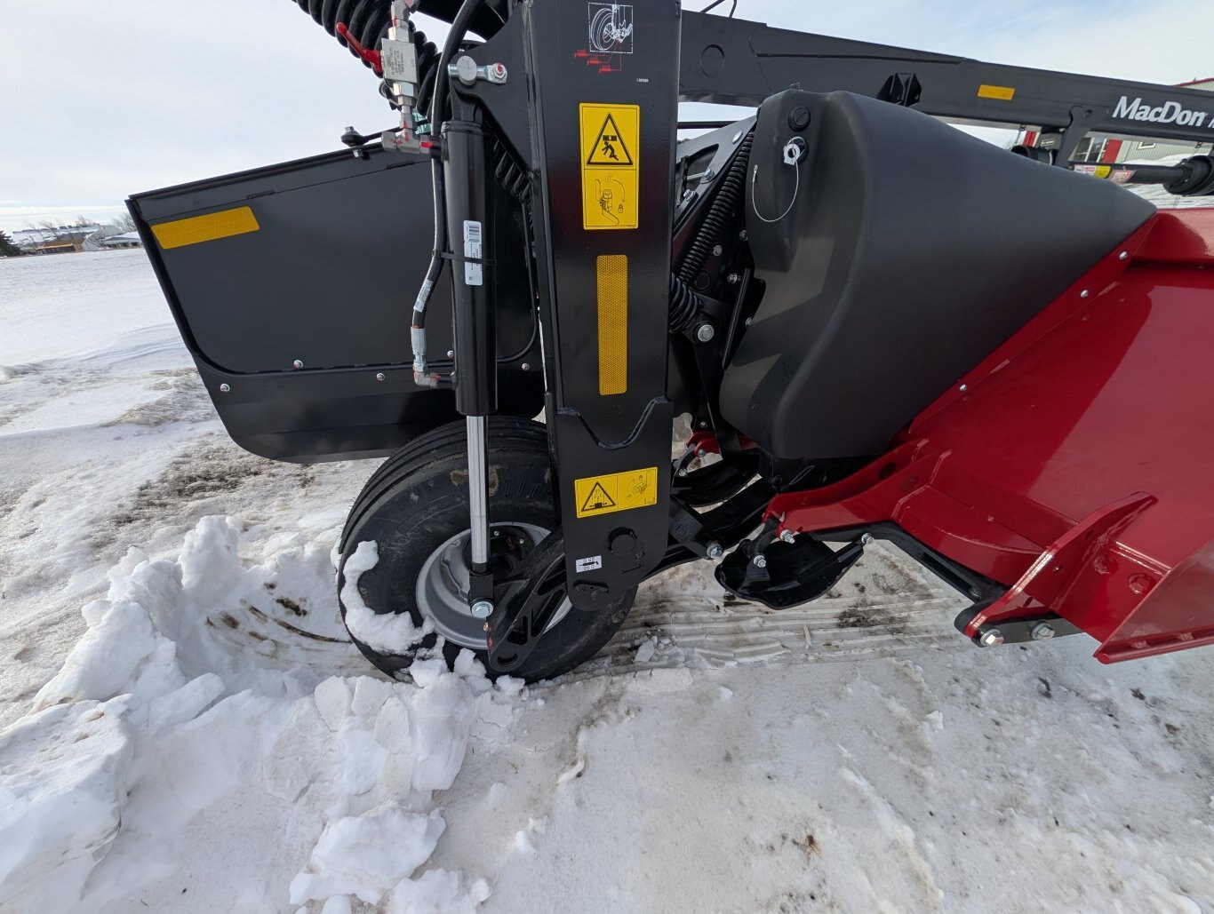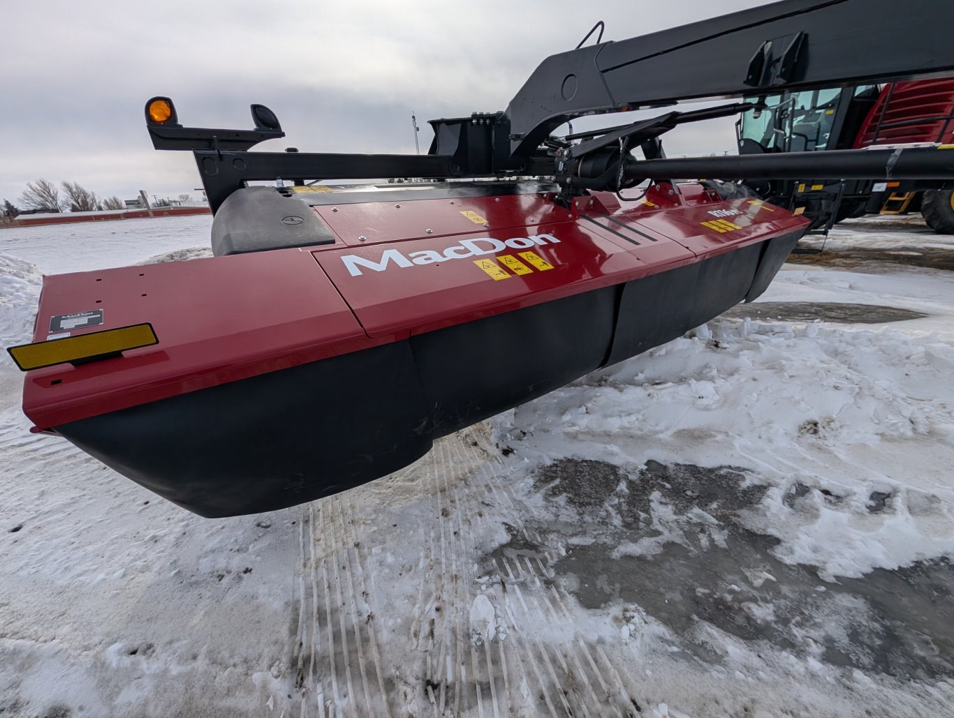 2026 MacDon R116. 16' Pull type mower/conditioner. Features forward-mounted cutterbar design and the industry's widest rolls at 129" which results in well-formed, well-conditioned windrows. Comes with a 3 year cutterbar warranty, and each of the discs features a shearpin which will disable it when contact is made that stops the disc. The disc then moves up and out of the path of the obstruction preventing any serious damage to the cutterbar. The shear pin can then be easily replaced in-field. Comes with steel inter-meshing rolls which are ideal for high volume crops where aggressive feeding through the header is required. In smooth stemmed crops, the steel roll action promotes even plant dry down by creating uniform crimps on the plant stem without bruising the delicate leaves. Extreme durability and minimal maintenance. -1000 pto -125hp min requirement -16' cutting width -10 discs, 2 blades per -6240 lbs -Requires 3 remotes with the hydraulic header angle adjustment option which is included -Intermeshing steel rolls