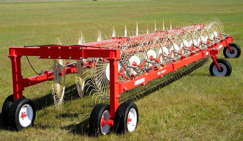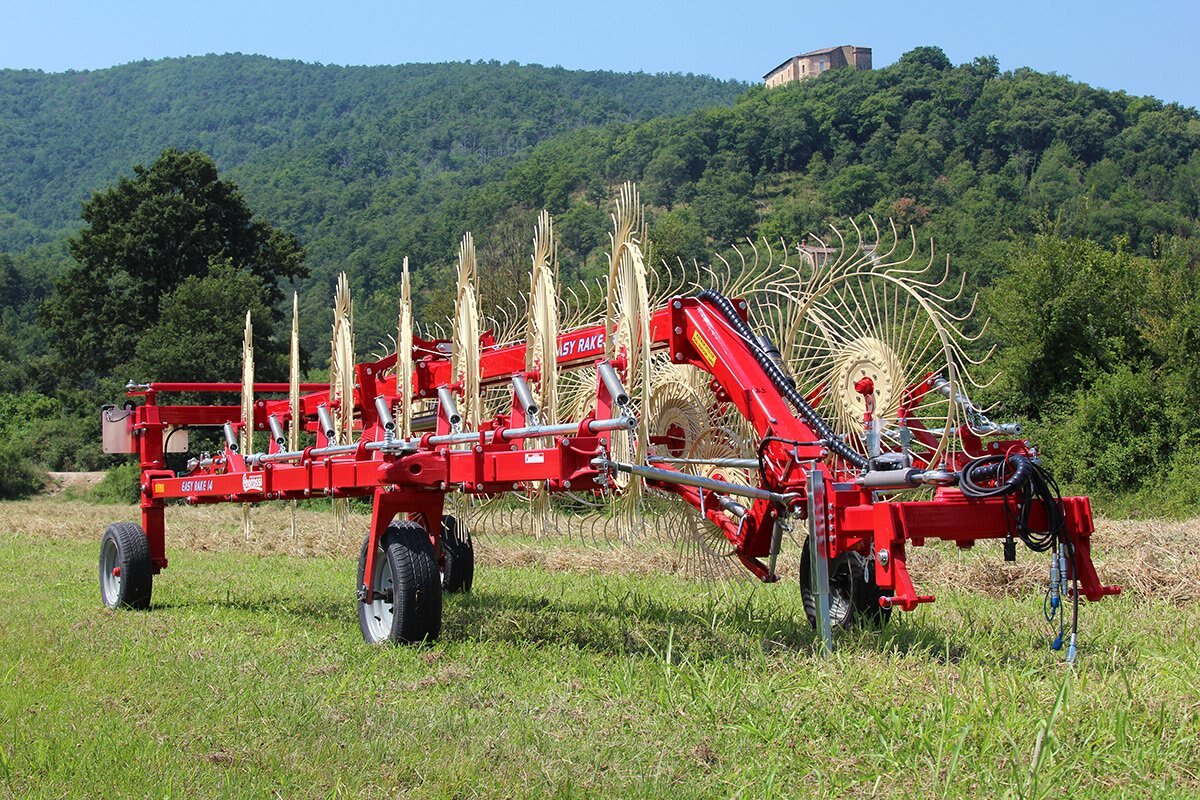 RAKING YOUR WINDROWS WITH THE FARM KING EASY RAKE ELIMINATES NUMEROUS FIELD PASSES AND PROVIDES UNIFORM ROWS. The Farm King Easy Rake comes available with 10, 12 and 14 rake wheel configurations and working widths of 21, 24 and 27 respectively. Each rake wheel comes with a fully independent suspension spring and bounce adjustment chain. The adjustable chain prevents the rake wheels from gouging uneven field terrain but allow the wheels to stay closely conformed to the field surface. |