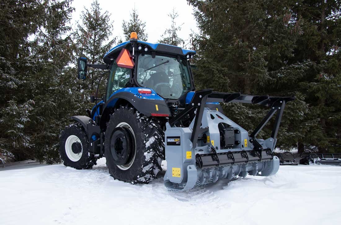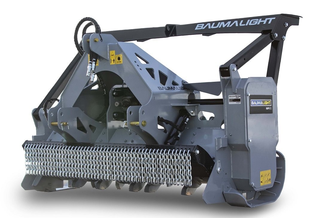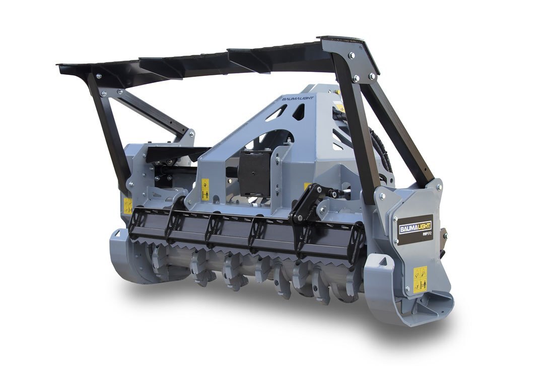 The 900 series Baumalight mulchers will efficiently mulch heavy brush and trees and are designed for contractors, rental and any other heavy duty mulching and land clearing. The MP972 masticating head Brush Mulcher is designed to fit tractors with 90 - 135 HP and Cat 2 or 3 3PH. The 900 Series teeth are available in either Ripper or Planer style. The carbide Ripper tooth is the good general use tooth. Their v-shaped design shreds through brush and makes them less vulnerable in areas plagued by rocks and debris. The 900 Series Planer style tooth provides the most efficient cutting by smoothly chipping away at the brush. Its flat profile however makes it vulnerable to shattering on impact with rocks and other debris. Tractor mounted brush mulchers are not limited to reverse only, drive forward over your mulch and turn it into a finer mulch. A usefull feature on the Baumalight MP972 Brush Mulcher is the opening cutting shield. This allows you to adjust for a better, higher angle of attack on bigger brush or keep it closed and control the mulch for even finer results. With direct drive from the engine, all the way through the heavy duty gear box, to the teeth, the MP972 PTO Brush Mulcher is a very efficient way to clear heavy brush and small trees.
