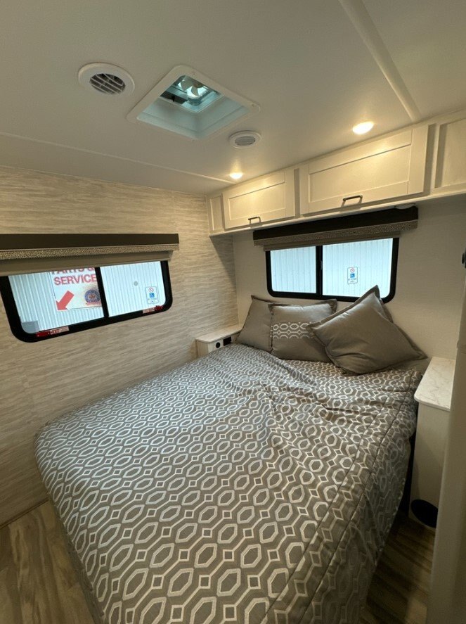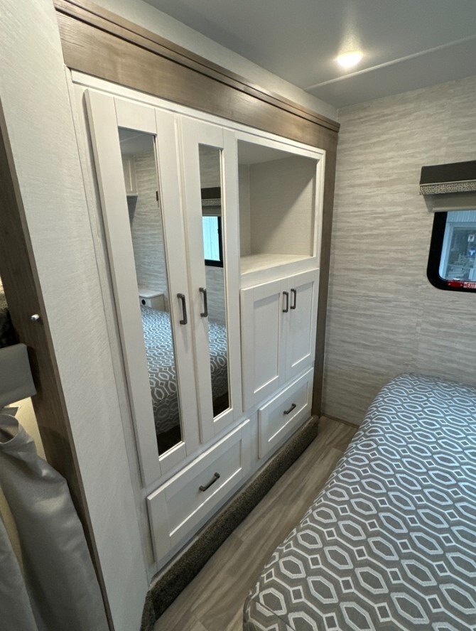 Private Bedroom with RV Queen Bed Rest easy with extra wardrobe storage.