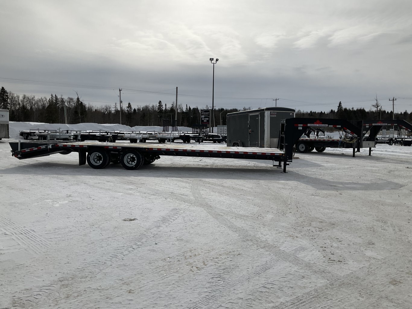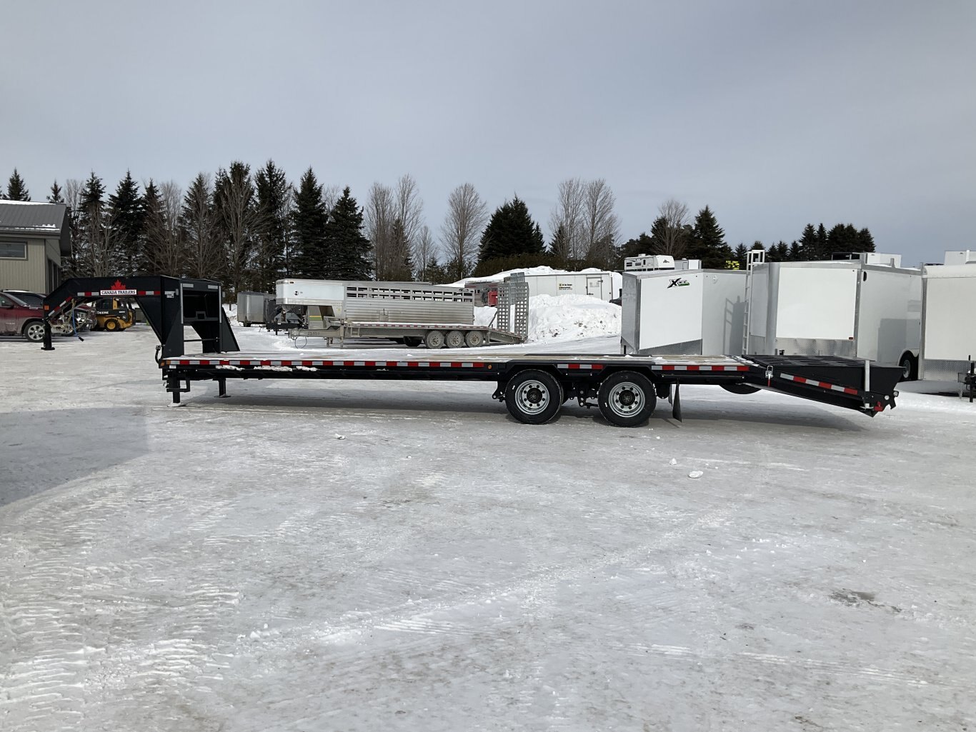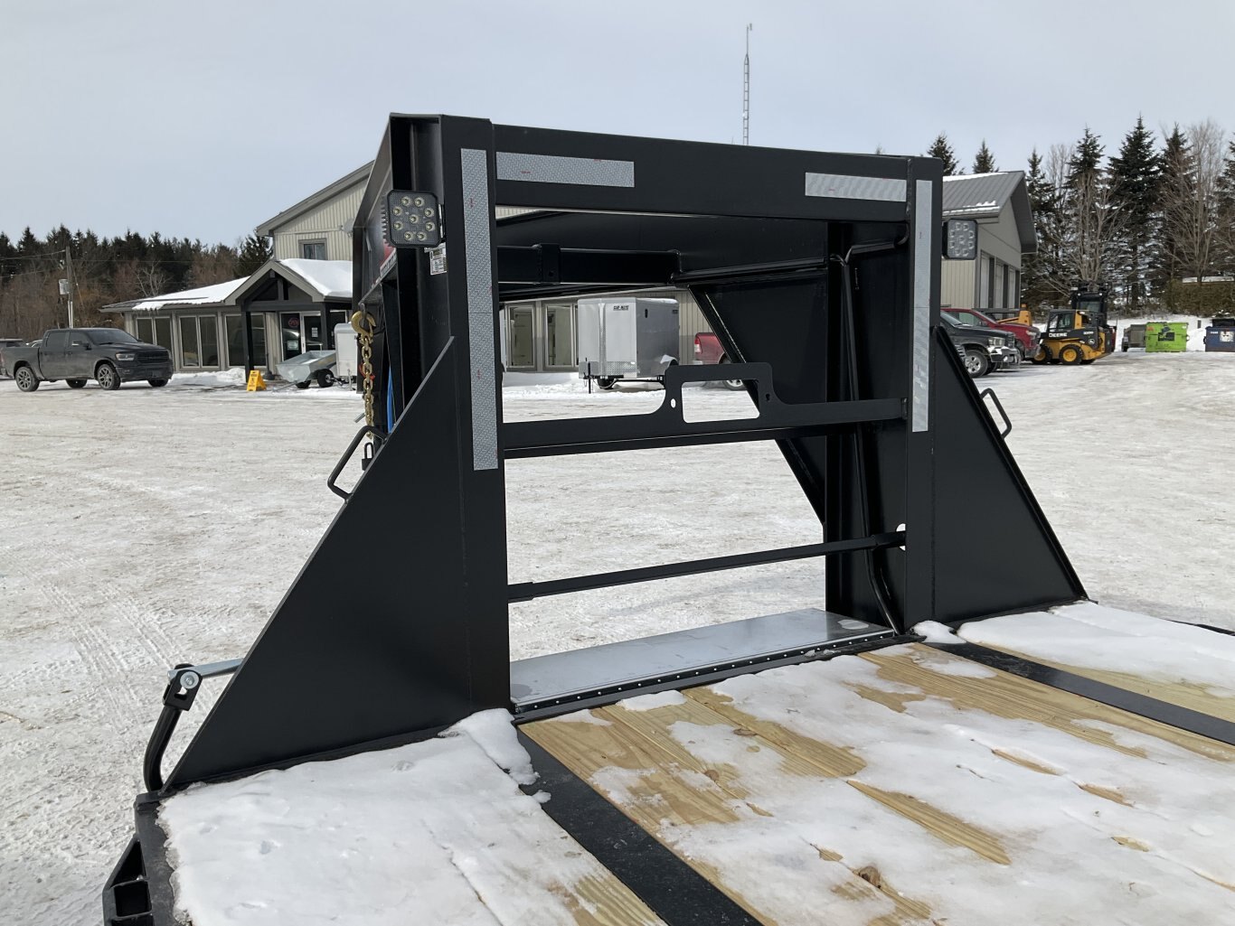 15,000LB GVWR, 2 30,000LB Tandem Dual Spring Axle with Oil Bath Hubs and Slipper Spring Suspension, Electric Brakes on Both Axles, 16 Inch Radial Tires, Adjustable Gooseneck Coupler, 2 12,000LB 2 Speed Drop Leg Jack, Torque Tube, 5' Full Width Ramps, 36' Deck Height, Cross Members Every 16", HD 1/4" Plate Over Axles, Pressure Treated Wood, 5' Angle Iron Beavertail, Stake Pockets and Rub Rails, 2 Side Steps, Drivers Side Winch Track, Spare Tire Mount, LED Sealed Lighting, Sealed Harness, Powder Coat Painted with Scorpion Stone Guard, Winch Plate Between Risers