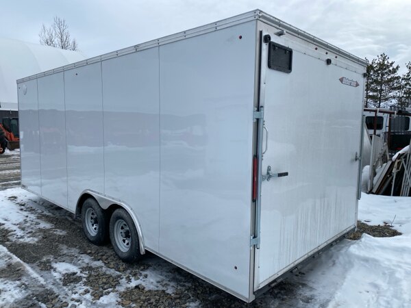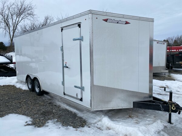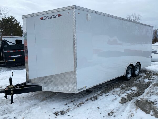 Externalspecs: 2026 White Weberlane W8520CCTW Cargo Trailer, steel\nframe, 8-1/2\' wide x 20\' long, wedge nose, 32\" side\ndoor, hd rear ramp door w/ spring aisst (8.5\'), 15\" side\npost c-c, 16\" floor cross, 16 roof centers, roof vent\nframe, tandem 5200lb drop axles, 2 axle electric brakes,\n205x15x5 bolt wheels - upgraded to galvanized wheels per\naxle, 2-5/16 ball coupler, jack, led lights, 3/4\nrainblock floor / 3/8\" sides, 84\" inside height, 4\'\nbeaver tail, d-rings tie-downs 5000lb - installed\nevernly spaced 4 per side, pair of side vents top front\nand lower rear