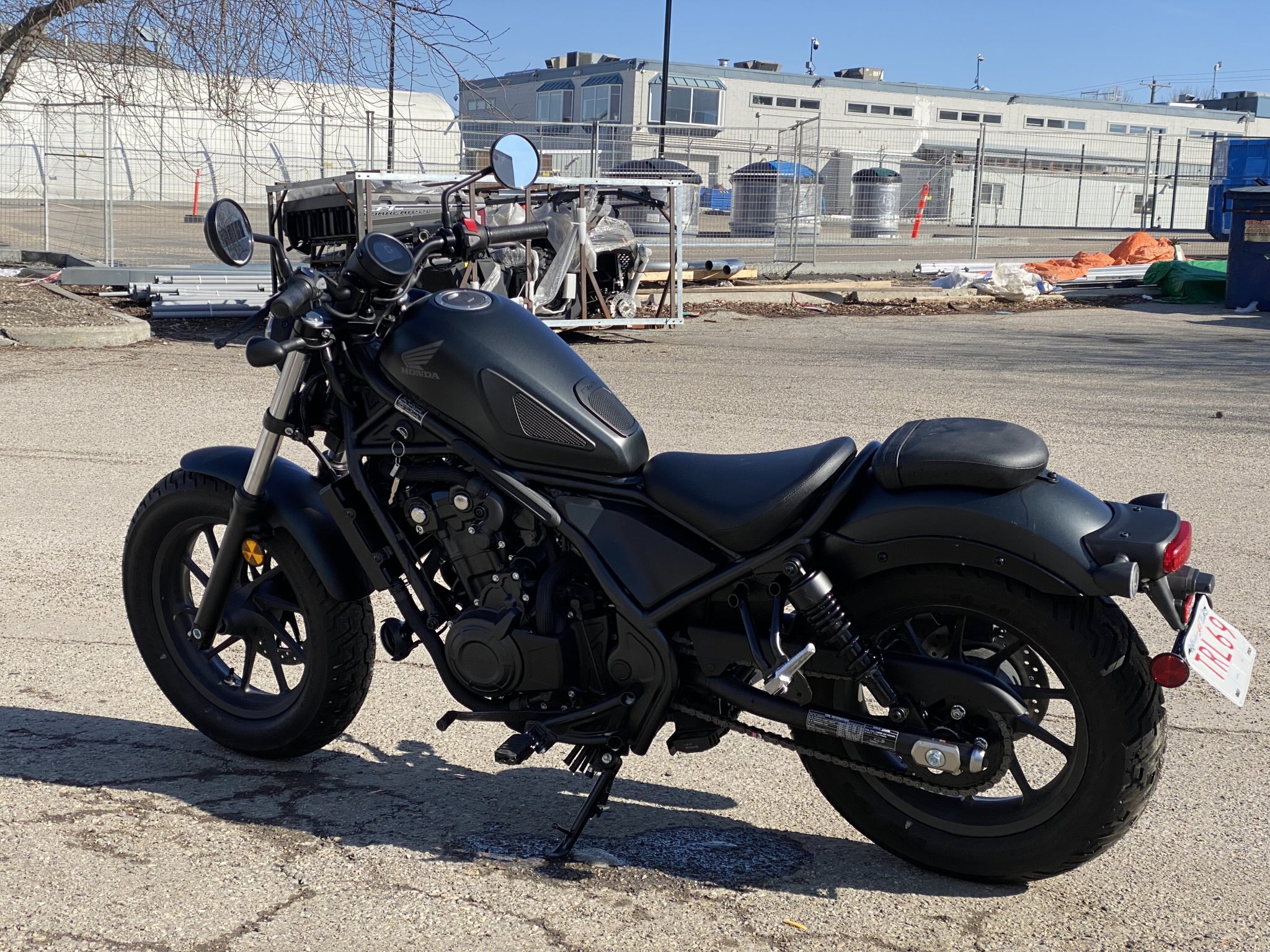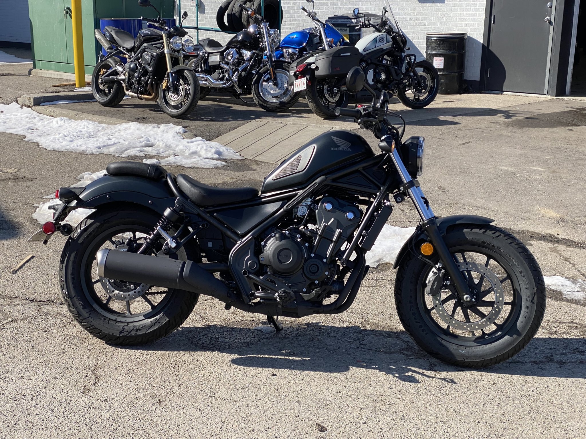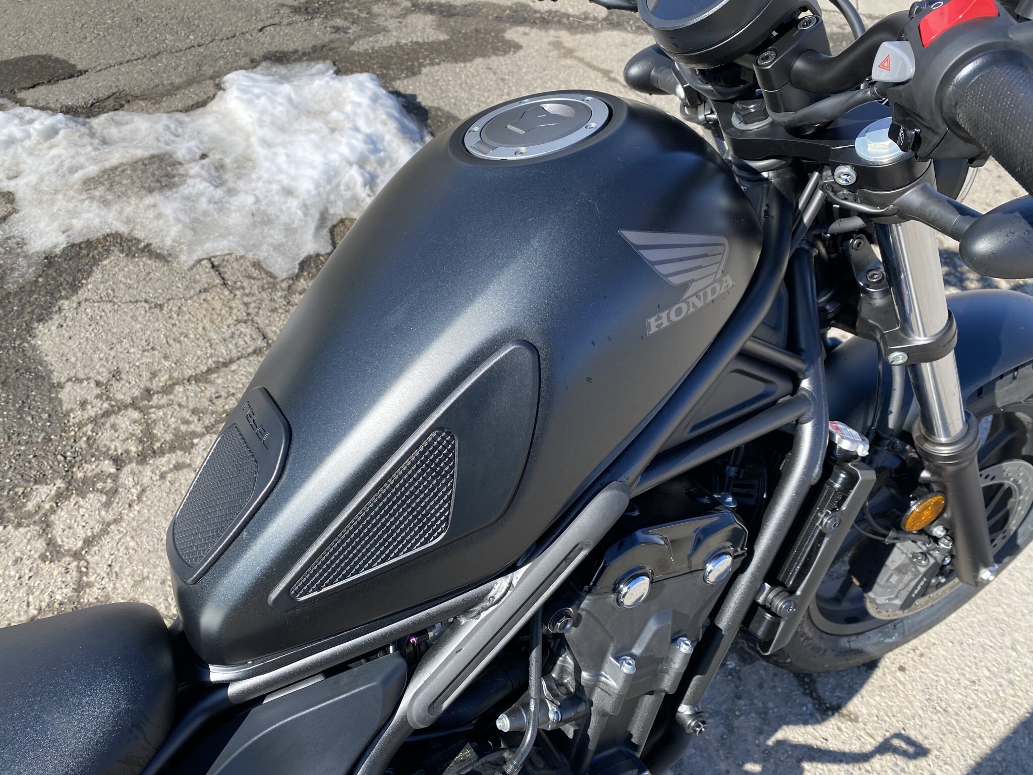 The 2025 Honda Rebel 500 ABS SE (Special Edition) is a cruiser motorcycle featuring a 471cc liquid-cooled parallel-twin engine, characterized by a low 27.2-inch seat height and "blacked-out" styling. The Special Edition adds factory-installed accessories, including a brown diamond-stitch seat, black fork boots, and a colour-matched headlight cowl.