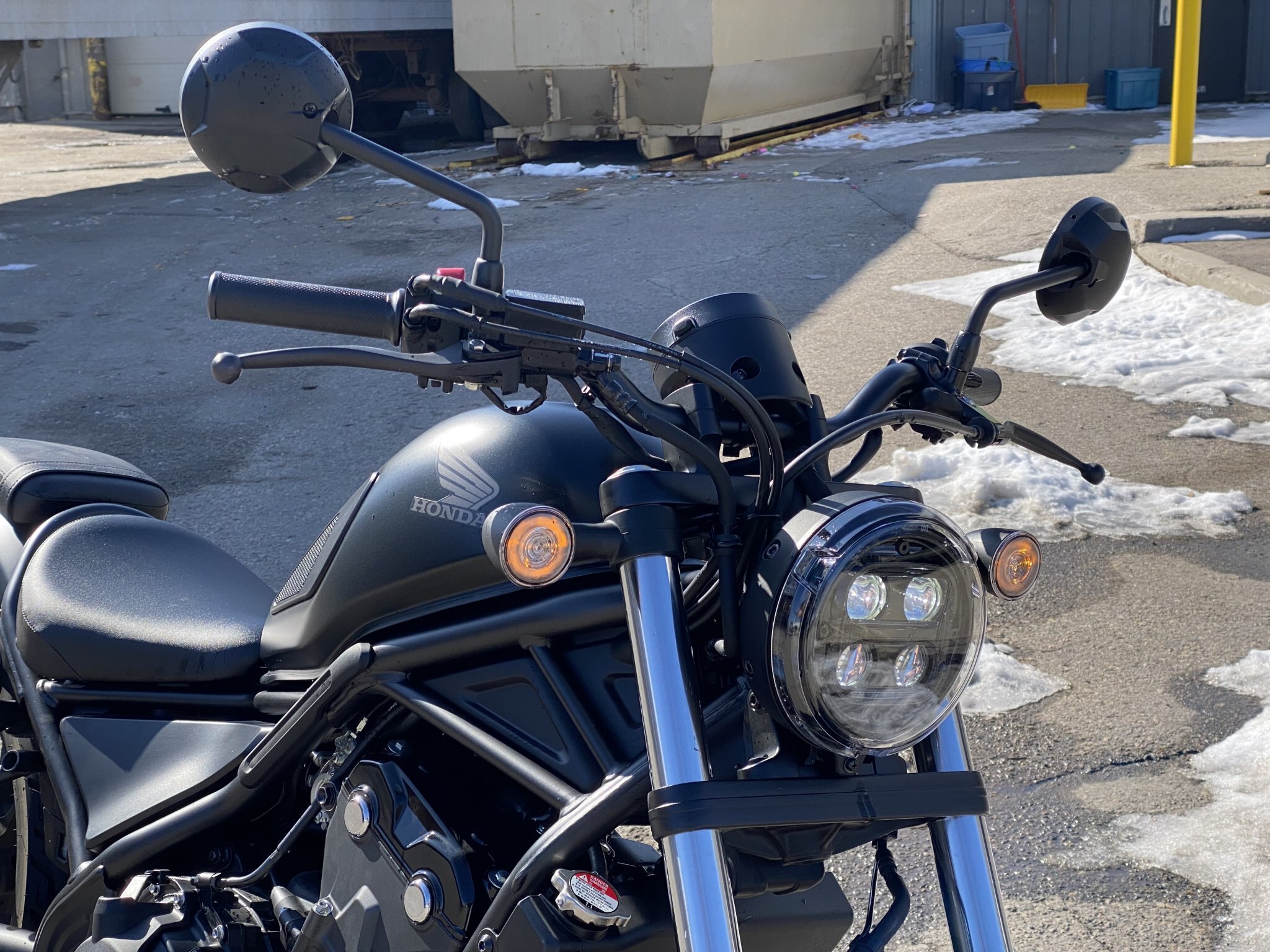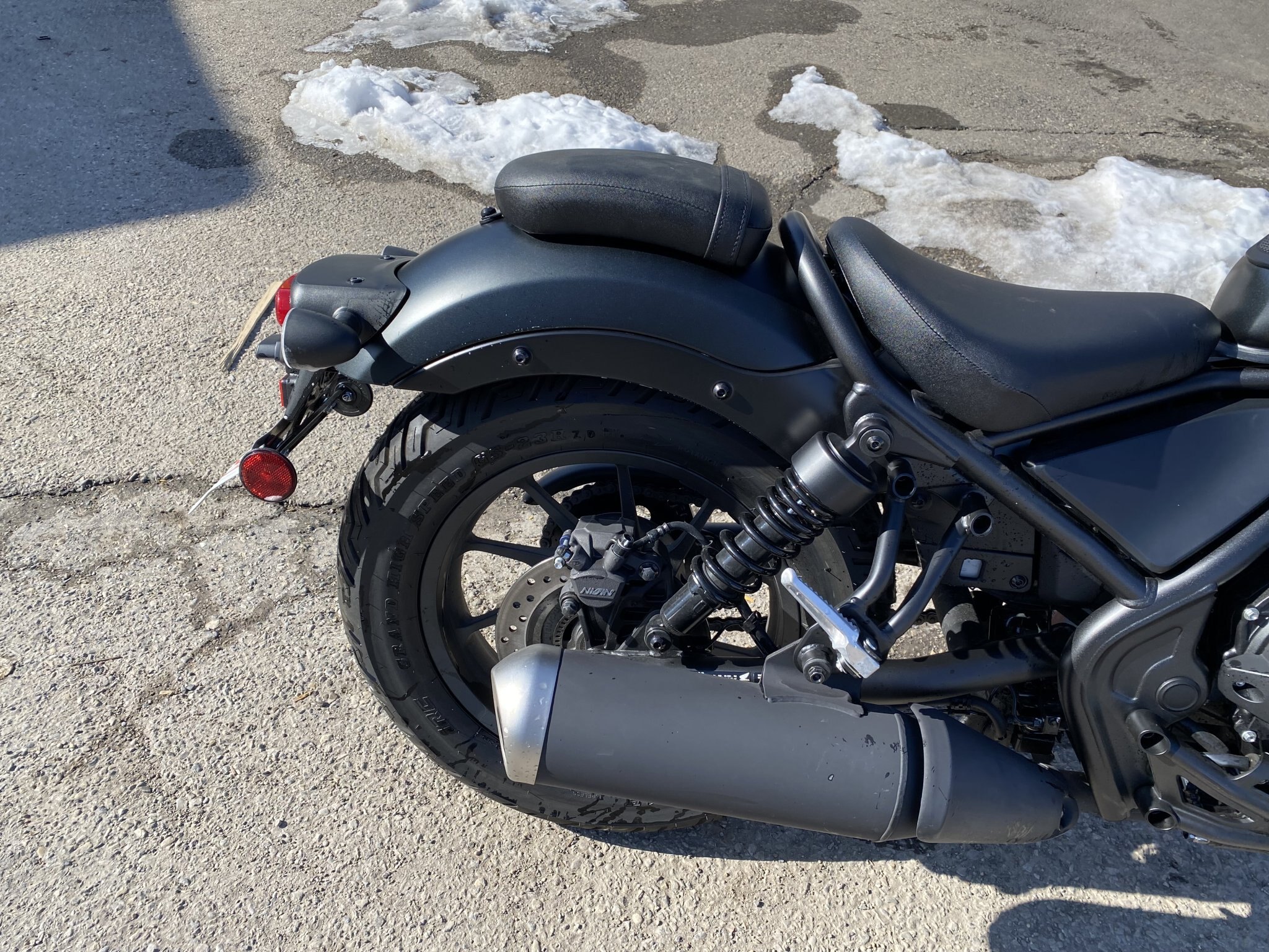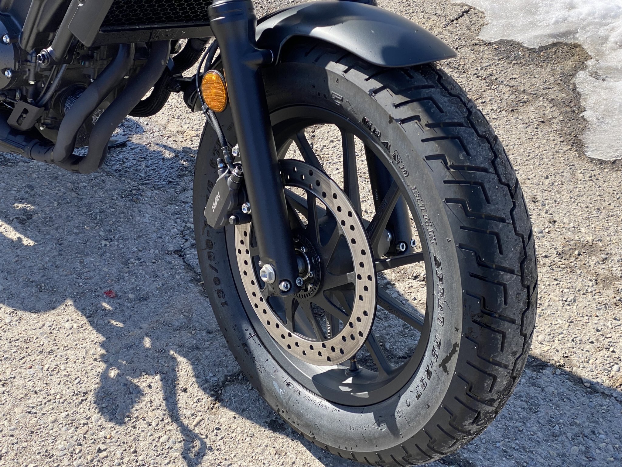 The 2025 Honda Rebel 500 ABS SE (Special Edition) is a cruiser motorcycle featuring a 471cc liquid-cooled parallel-twin engine, characterized by a low 27.2-inch seat height and "blacked-out" styling. The Special Edition adds factory-installed accessories, including a brown diamond-stitch seat, black fork boots, and a colour-matched headlight cowl.