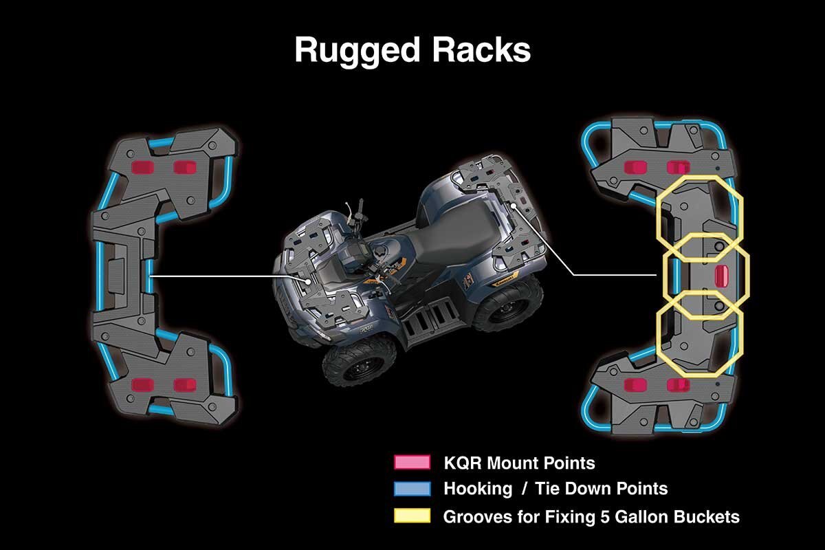 | Energize work and play on the Brute Force 450 ATV. Powerful, nimble, and stacked with utility features, no other mid-size ATV gives you more. Tackle demanding chores capably, while enjoying unique sporty performance that can only be delivered by Kawasaki. Strong build quality pairs with aggressive style for a durable ride that never fails to excite. No matter the task the Brute Force 450 ATV is built for you. When you need more capability, the new Brute Force 450 (EPS) ATV steps up. Speed-sensitive EPS delivers sporty, confident handling, while front and rear steel cargo racks with plastic cargo rack covers, integrated KQR mounts, tie-down points, and bucket-retainer grooves ensure quick, secure loading. |