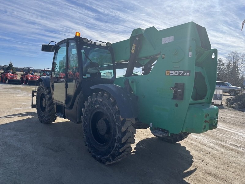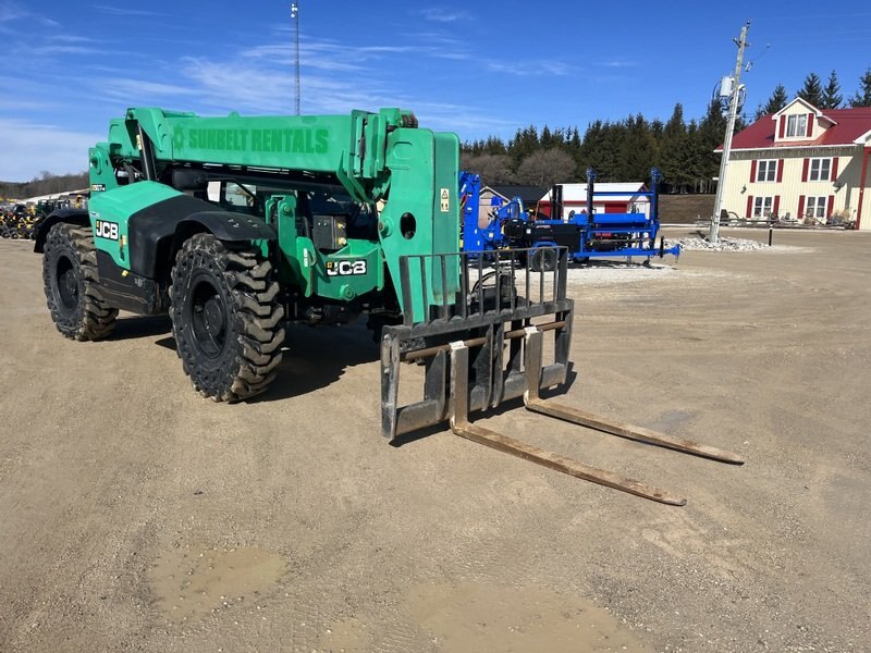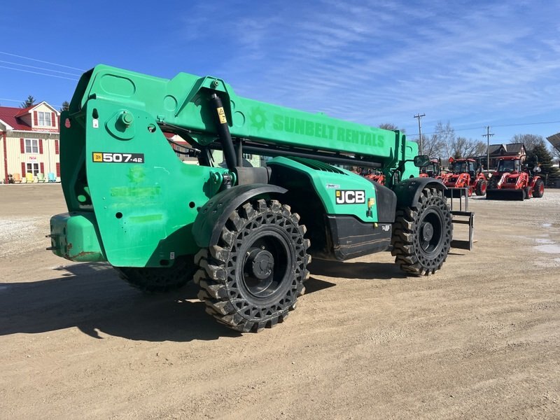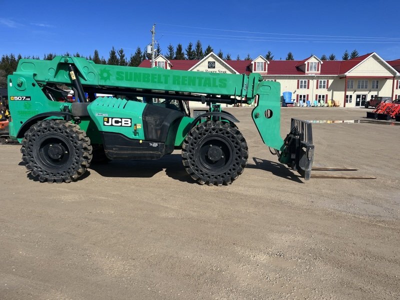 2015 JCB 507-42 zoom boom powered by JCB diesel engine. Enclosed heated cab with glass intact. Equipped with manual quick connects, hydraulic tilt forks and auxiliary hydraulics . Max height of 42’. Max lift of 7000lbs. Machine weights about 21000lbs. Hour meter reads 4173.