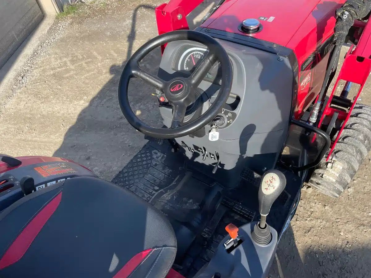 Used ROPS MfD tractor with 1635L Quick Attach Loader Bucket (new). Skidsteer Q/A. Hydro transmission.