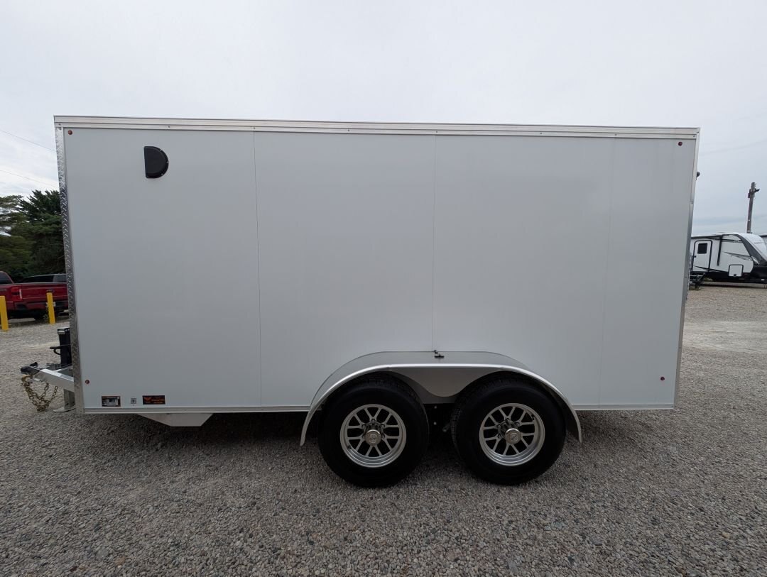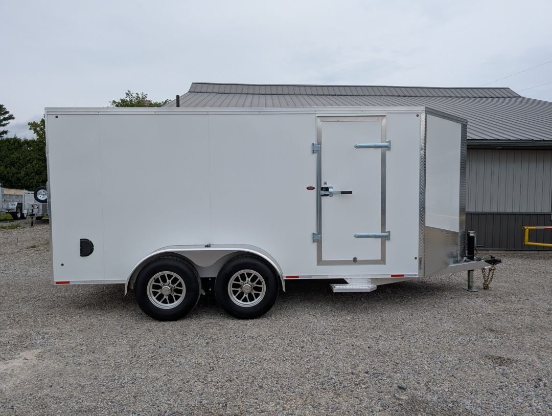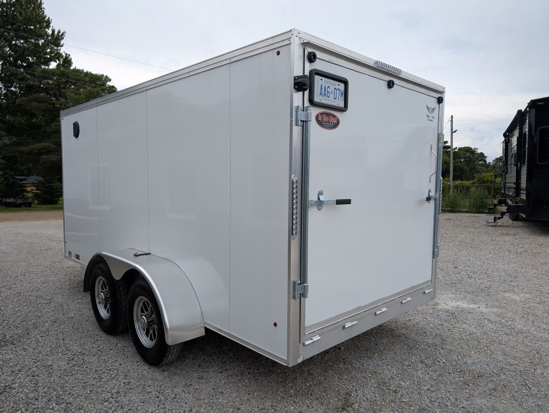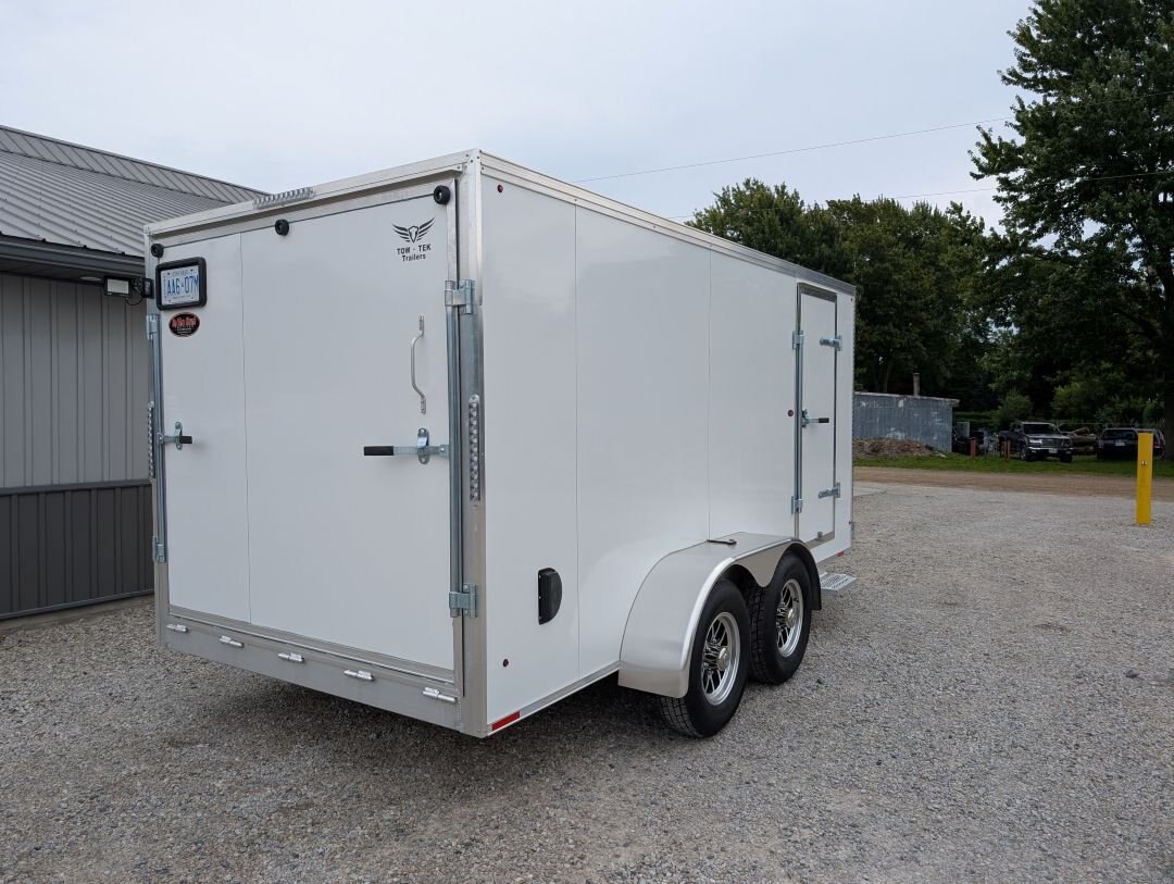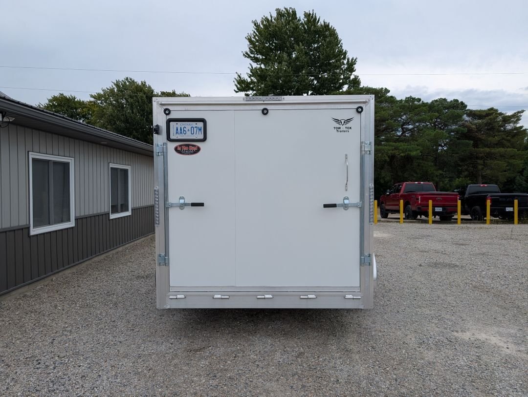 The 2025 Tow-Tek 7x14 Transcend Aluminum Enclosed is in stock at In The Hunt Trailers! This tandem 5200lb axle aluminum enclosed cargo trailer is outfitted with contractor grade materials and ready for your next adventure or jobsite. Finance this unit for as low as $52/week OAC. This unit features the following options: Colour: White - 90 degree V-nose - Tandem 5200lb Axles - 2\'\' x 4\'\' Aluminum Cross Members - 2\'\' x 6\'\' Aluminum Main Frame - Standard Height (6\') - 16\'\' On Center Floor and Sidewalls - 12\'\' On Center Roof - 2-5/16 Coupler - (4) Rechargeable LED Interior Lights - (4) Mounted E-Trac Lengths - Square Man Door With RV Flush Lock & Cambar Lock - HD Safety Chains - Medium Duty Rear Ramp with Spring Assist - 3/8\'\' Drymax Walls - 3/4\'\' Drymax Floors - Smooth Mahogany Trim - One Piece Aluminum Roof