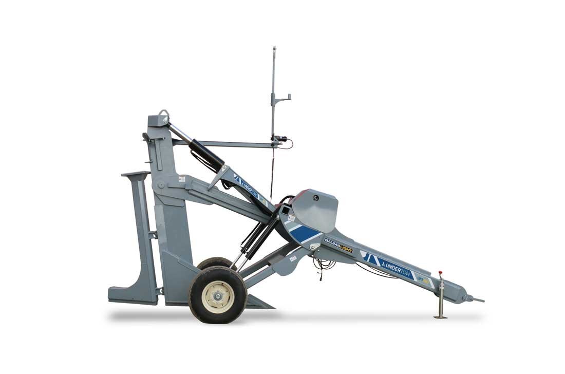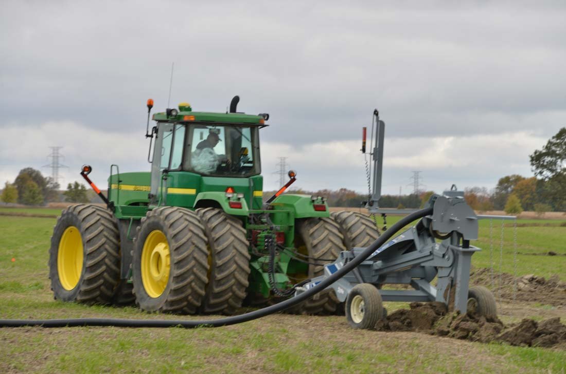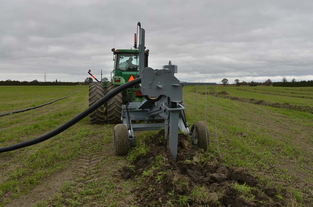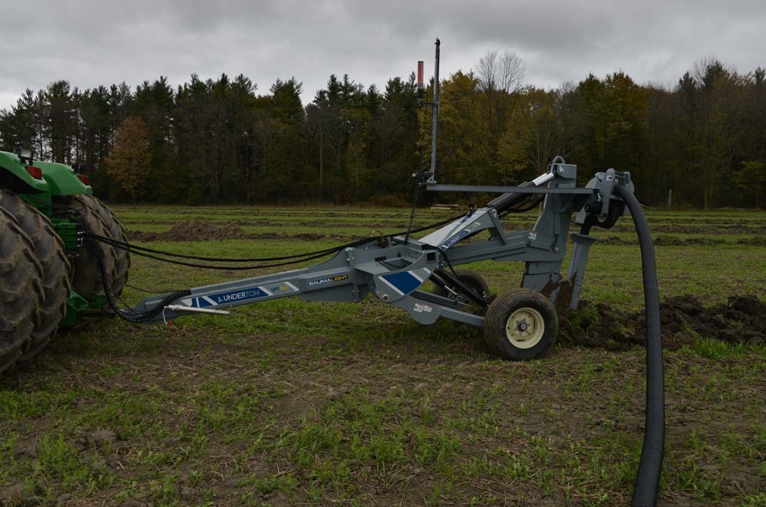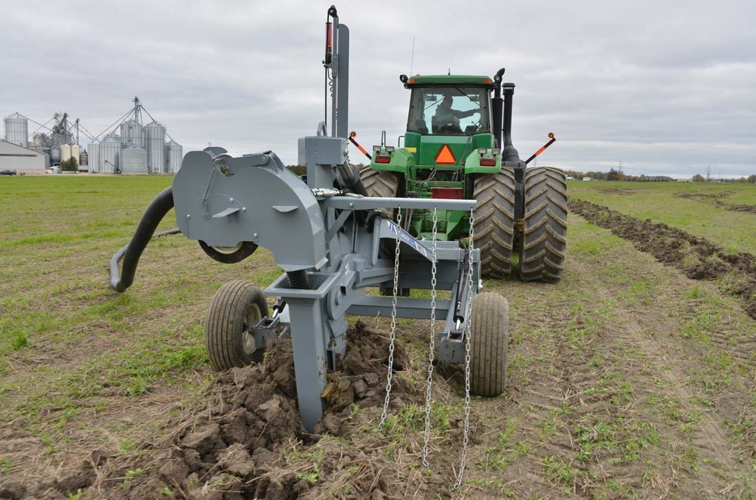For bulldozers, hooking up to the Undertow's Draw Bar Plow model is fast and easy and is set up to lay drainage tiles up to 5 ft deep. There is a manual override on the mast to offset the laser beam if needed and in cab digital controlling to make sure all your tiles are angled down. Includes a 4” & 6” boot and laser controls.