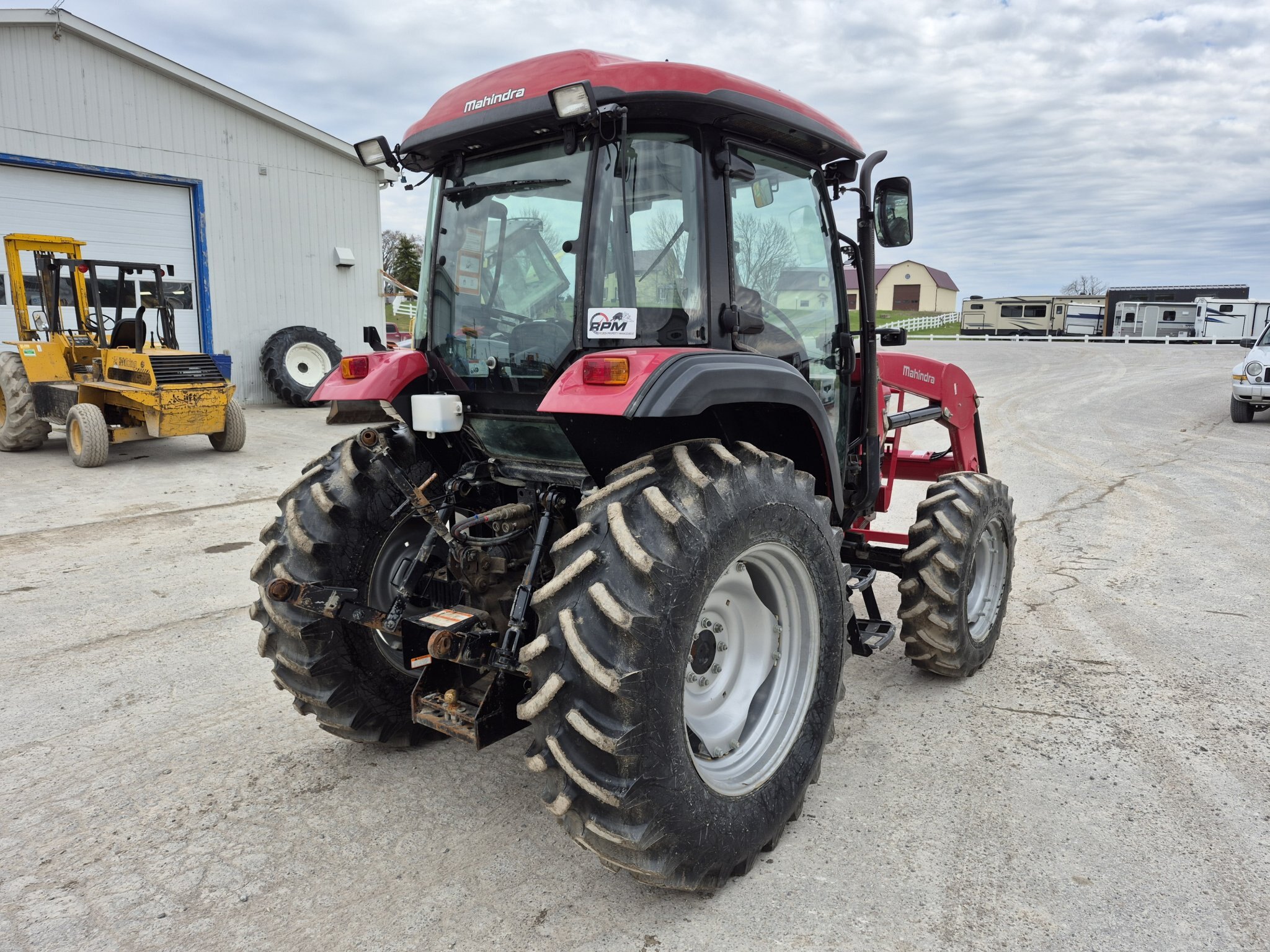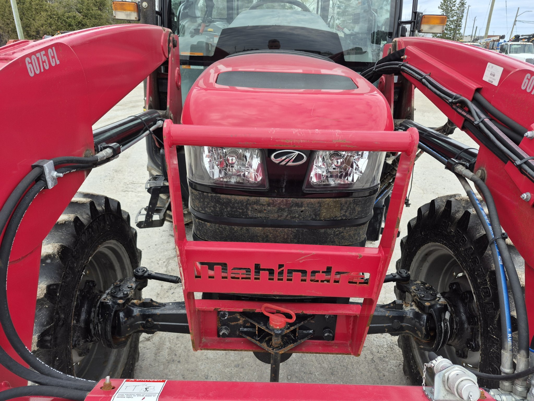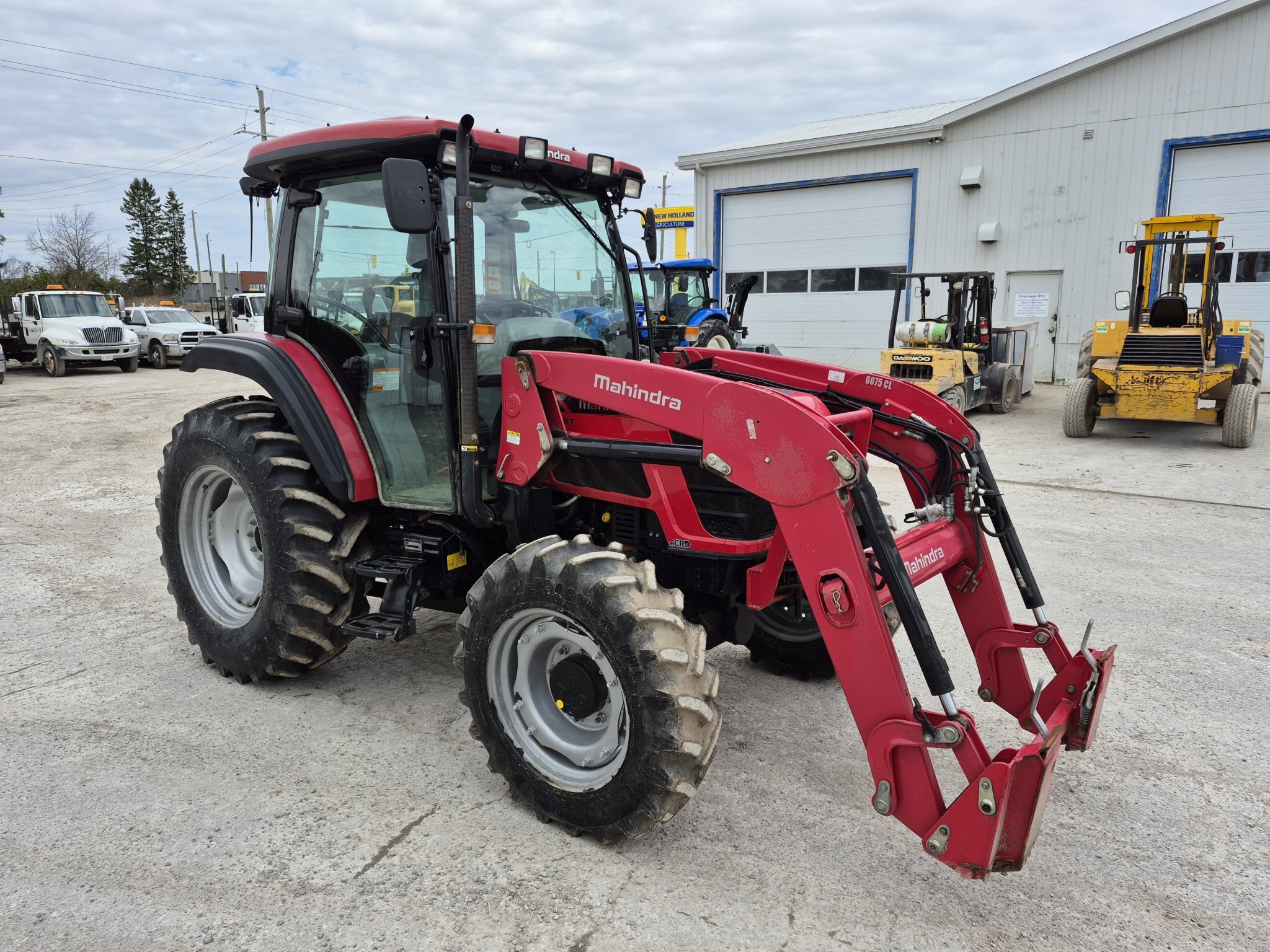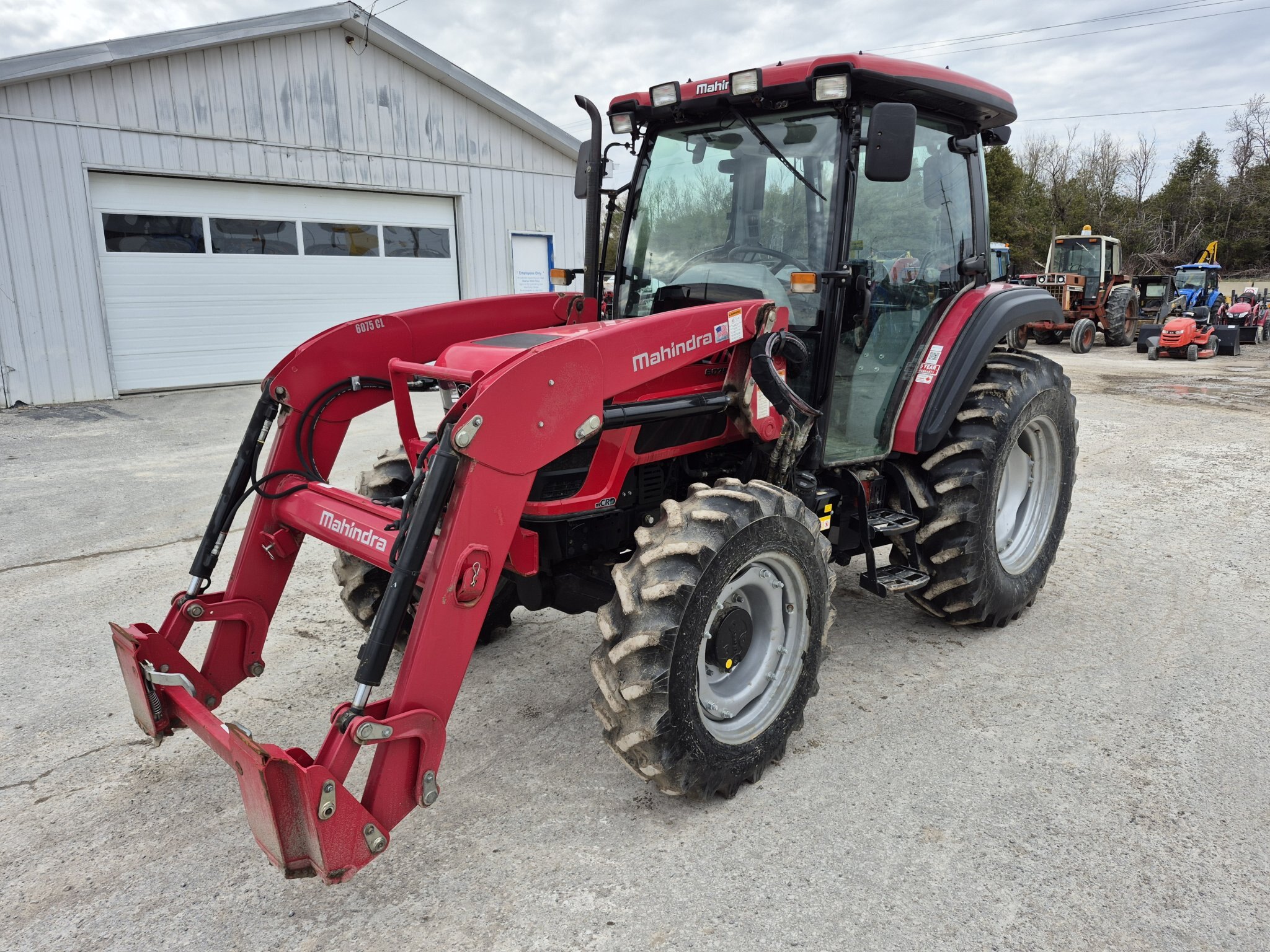 2020 Mahindra 6075, 71 engine horsepower, 61 pto horsepower, Four wheel drive, Cab with heater & air conditioning, 15 forward x 15 reverse speed transmission with Power Shuttle, Radio, (2) sets of rear remotes, 540/540E pto, 3 point hitch, Mahindra 6075CL loader with universal skidsteer quick-attach, 16.9-30 rear tires, 11.2-24 rear tires, 3rd function hydraulics to front of loader from rear remote, 1000 hours