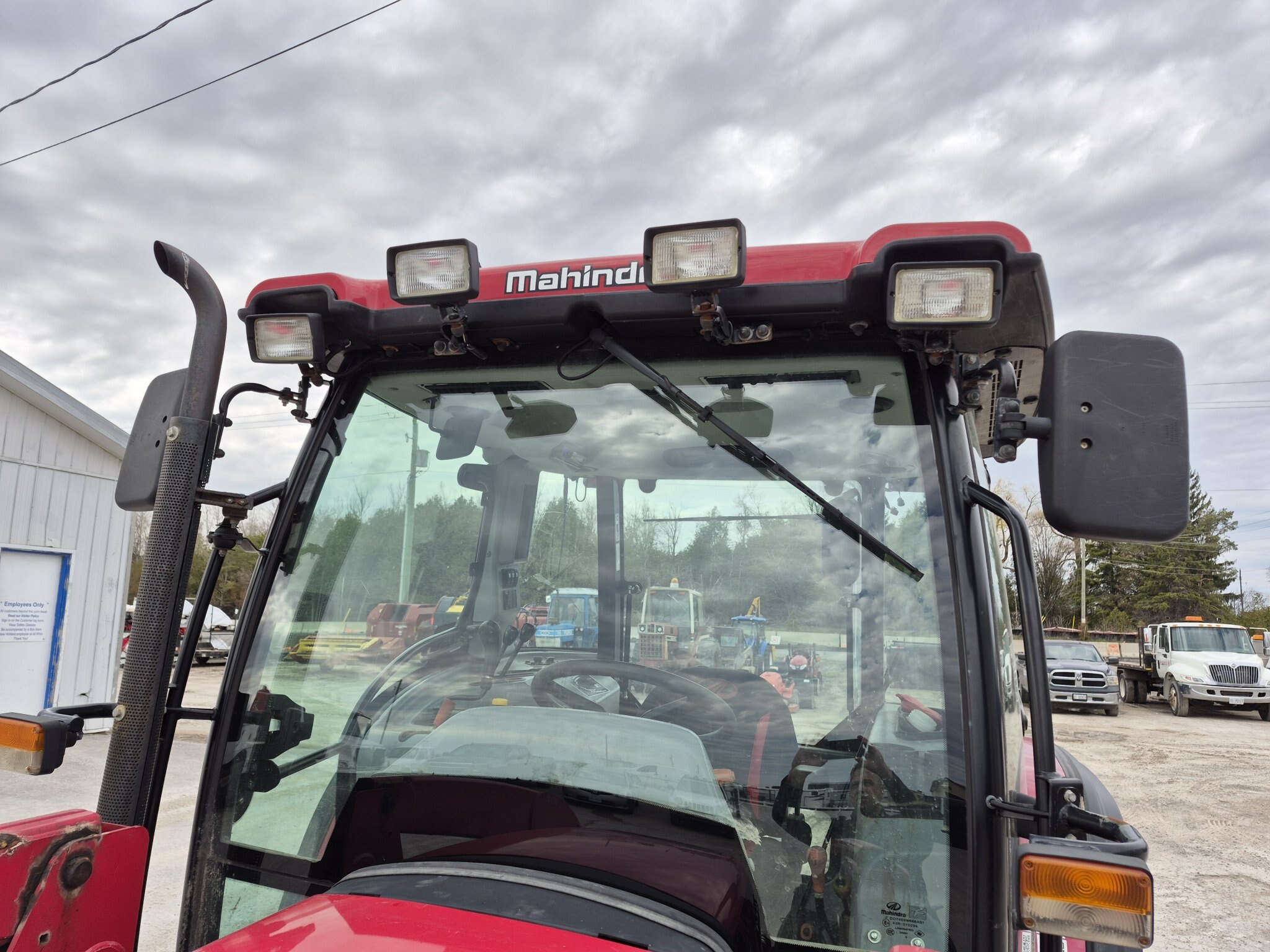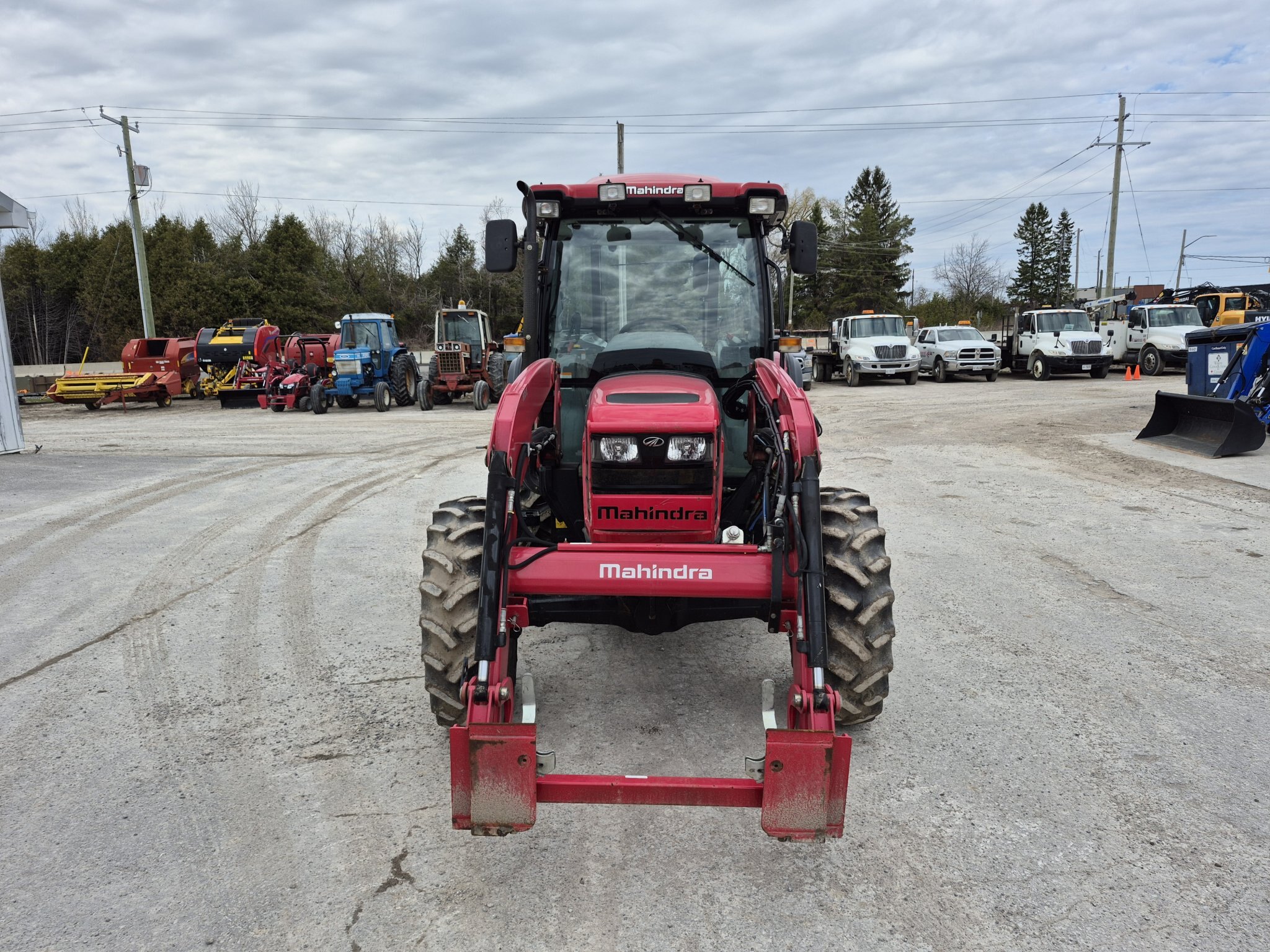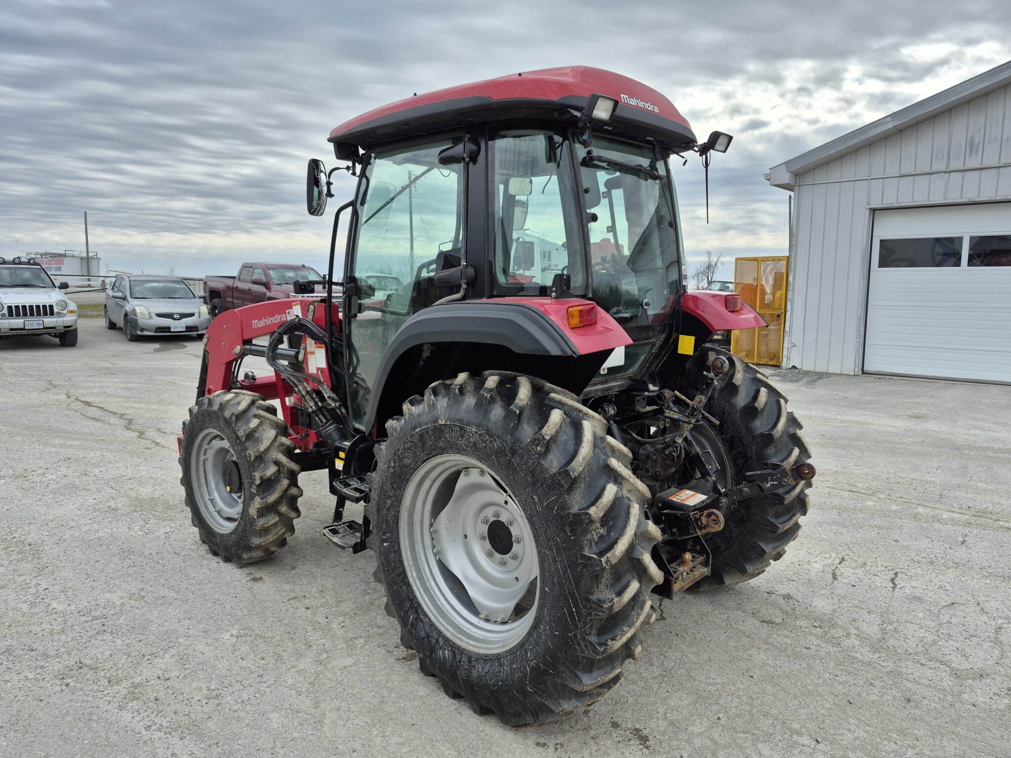 2020 Mahindra 6075, 71 engine horsepower, 61 pto horsepower, Four wheel drive, Cab with heater & air conditioning, 15 forward x 15 reverse speed transmission with Power Shuttle, Radio, (2) sets of rear remotes, 540/540E pto, 3 point hitch, Mahindra 6075CL loader with universal skidsteer quick-attach, 16.9-30 rear tires, 11.2-24 rear tires, 3rd function hydraulics to front of loader from rear remote, 1000 hours