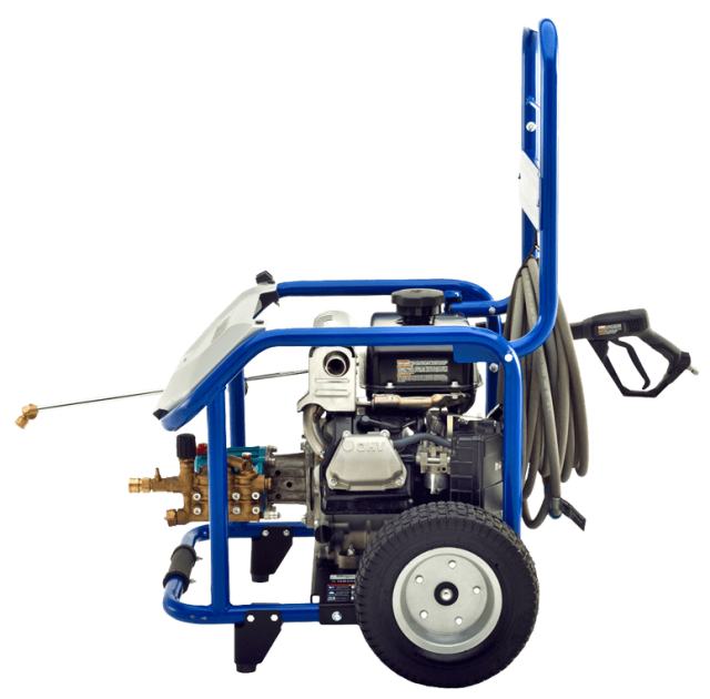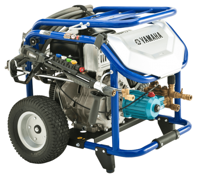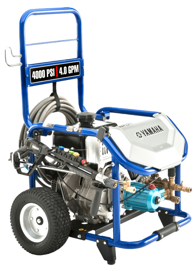 Designed for the rigors of industrial or commercial grade use, the new PW4040 pressure washer from Yamaha offers 4,000 psi of pressure and moves 4 gallons per minute. The PW4040 is ready to tackle the most demanding pressure washing jobs with its unbeatable combination of Yamaha 4-stroke power and proven Cat Triplex pump technology. .igg{float:right; padding:10px;} .tdg{border-bottom:1px solid #dedede;} .ttl{width: 100%; height: 30px; background-color: #eeeeee; line-height: 26px; padding-top: 2px; font-weight: bold; color: #fff; margin-top: 10px; color: #df0101; font-size: 14px; clear: both;} .list ul{list-style:disc; padding-left:10px;} .list li{ Yamaha Power Ultra reliable, MZ360 engine, 357cc, air-cooled, OHV, single cylinder, 4-stroke engine. EPA & CARB approved. Automatic idle down feature reduces fuel consumption and wear & tear. Quick Connect Brass Fittings and Steel Braided Hose Quick connect, corrosion resistant, brass fittings mean a solid, positive connection every time. 50 ft. (15.2m) braided steel, high-pressure hose means a longer reach and rugged durability. Rubber cover prevents scratching. Features Reliable and fuel efficient, Yamaha MZ360, 357cc, air-cooled, OHV, single cylinder, 4-stroke engine. Auto decompression system provides a light recoil starter pull for effortless manual starting. Maintenance-free transistorized controlled electronic ignition (TCI) provides a hot spark for fast, easy starting. Cast iron cylinder liner provides excellent heat dissipation for consistent performance and long engine life. Yamaha's Oil Watch Warning System automatically shuts off the engine when oil level is low and will not re-start until oil is added, preventing costly engine damage and enhancing long-term durability. Automatic idle down feature reduces fuel consumption, noise and wear & tear. On - off fuel petcock for easy transporting and storage. Cleanable spark arrestor 6 litre fuel tank for extended run time (PW4040 uses regular 87 octane fuel) Durable, brass Triplex CAT Pump® ... a world leader in pressure washer pumps Delivers 4,000 psi and 4.0 gpm (gallons per minute) of industrial grade performance to get the job done quickly and efficiently 3-position pivoting nozzle tip makes it easy to get into those hard to reach spots Multi-tip selection: 0º tip , 15º tip, 25º tip, 35º tip, 40º tip. Tips are conveniently located on a special casing that attaches to the pressure washer gun / wand or can be clipped to a belt loop. No need to lose time walking back to the main unit to change tips. Rotating secondary grip (360 degrees) adds additional support and can be rotated to any angle and then locked into place. 15 m / 50 ft. braided steel rubber wrapped hose provides a longer reach and rugged durability. Rubber covering helps prevent scratches and scuffs Convenient on-board storage for spray gun/wand and high pressure hose Durable corrosion resistant, quick connect, brass connectors and plated steel hose fittings provide a solid, positive connection each and every time. 53" soap injection hose (for use with remote soap containers) Never-flat, non-pneumatic tires. "Dolly style" fold flat handle makes moving, transporting and storage easy. This design takes up less space and also allows storage of lightweight items on top of the unit when folded.