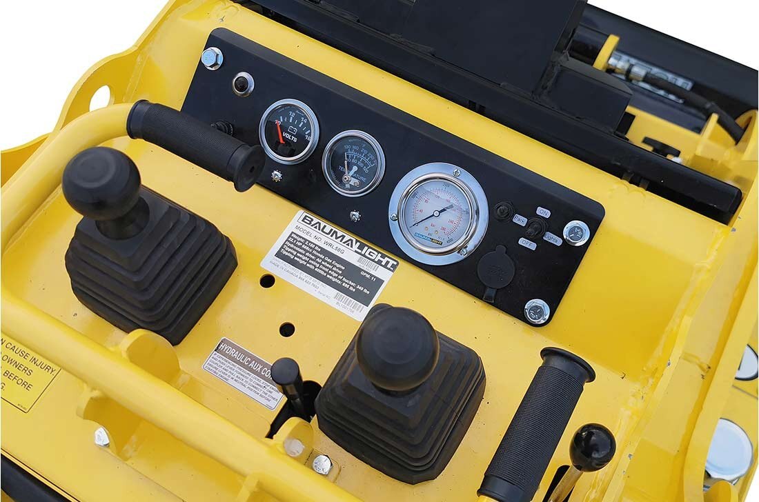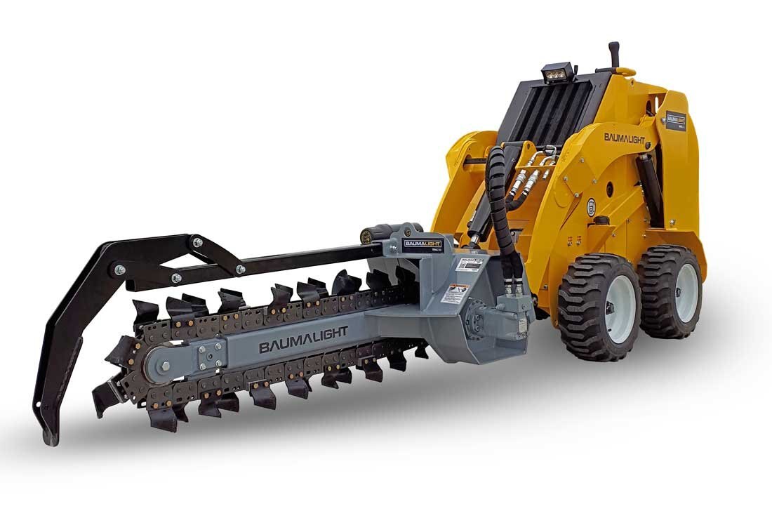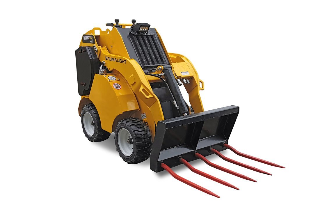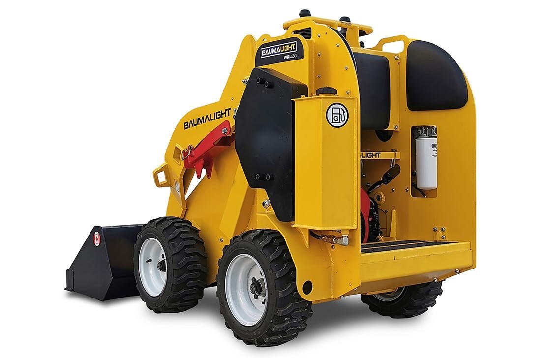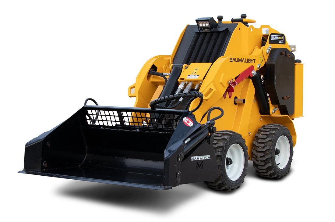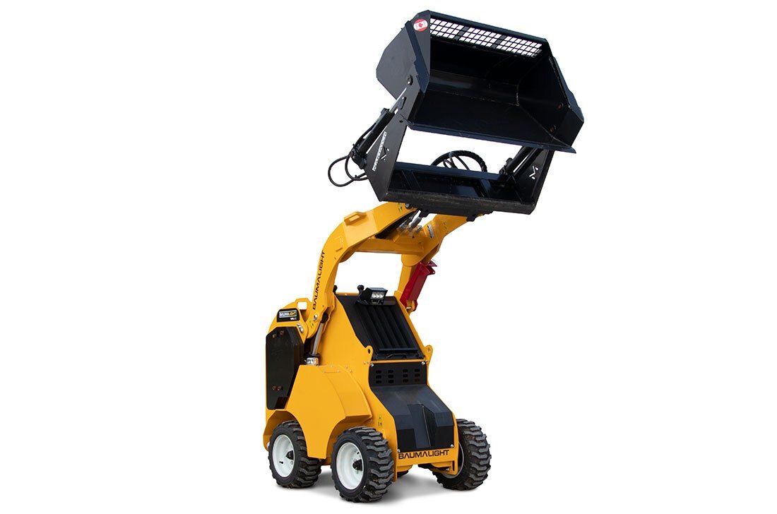 The Baumalight wheeled mini skidsteer is manufactured in Ontario Canada and powered with a Honda engine, the compact wheeled mini tool carriers are designed to easily navigate through tight spaces and are offered with two speed as an option. The hydrostatic drive is set up with true joystick controls with hydraulic pilot lines just like large skidsteers have. The remote hydraulic pump system with case drain delivers hydraulic flow that can be set to maximum engine capacity and the optional self-levelling bucket reduces spills and provides extra control when loading and unloading material. The Baumalight mini skidsteer features durable tires designed like wheels for large skidsteers that can handle uneven or rough terrain, and a ride-on platform raised for improved visibility while maneuvering through confined areas.