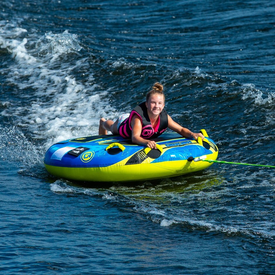The Screamer is the perfect tube for a rider to get whipped out and bounced around to their heart's content. Its flat deck with EVA pads is comfortable to lay or kneel on. Multiple handles allow the rider to modify their position on the tube to handle any upcoming challenges that the driver musters up. If you are looking for a single rider tube, the Screamer is definitely the way to go.