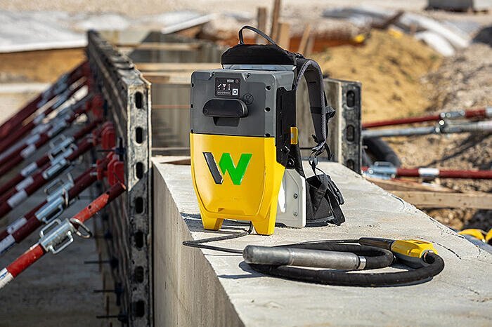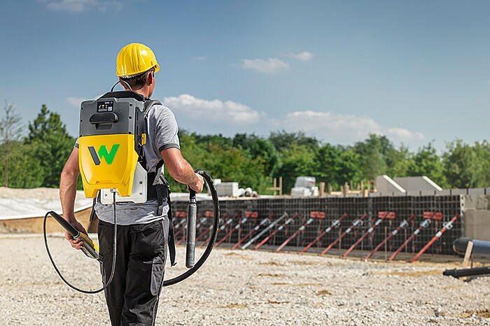 The cordless ACBe battery backpack vibrator system is ideal for the consolidation of thick interior concrete slabs with and without reinforcing steel and is an excellent choice for job sites that have strict guidelines for noise and emissions. The rechargeable battery provides zero emissions energy for an entire working day and the operator is not longer exposed to heat, exhaust fumes and engine noise.